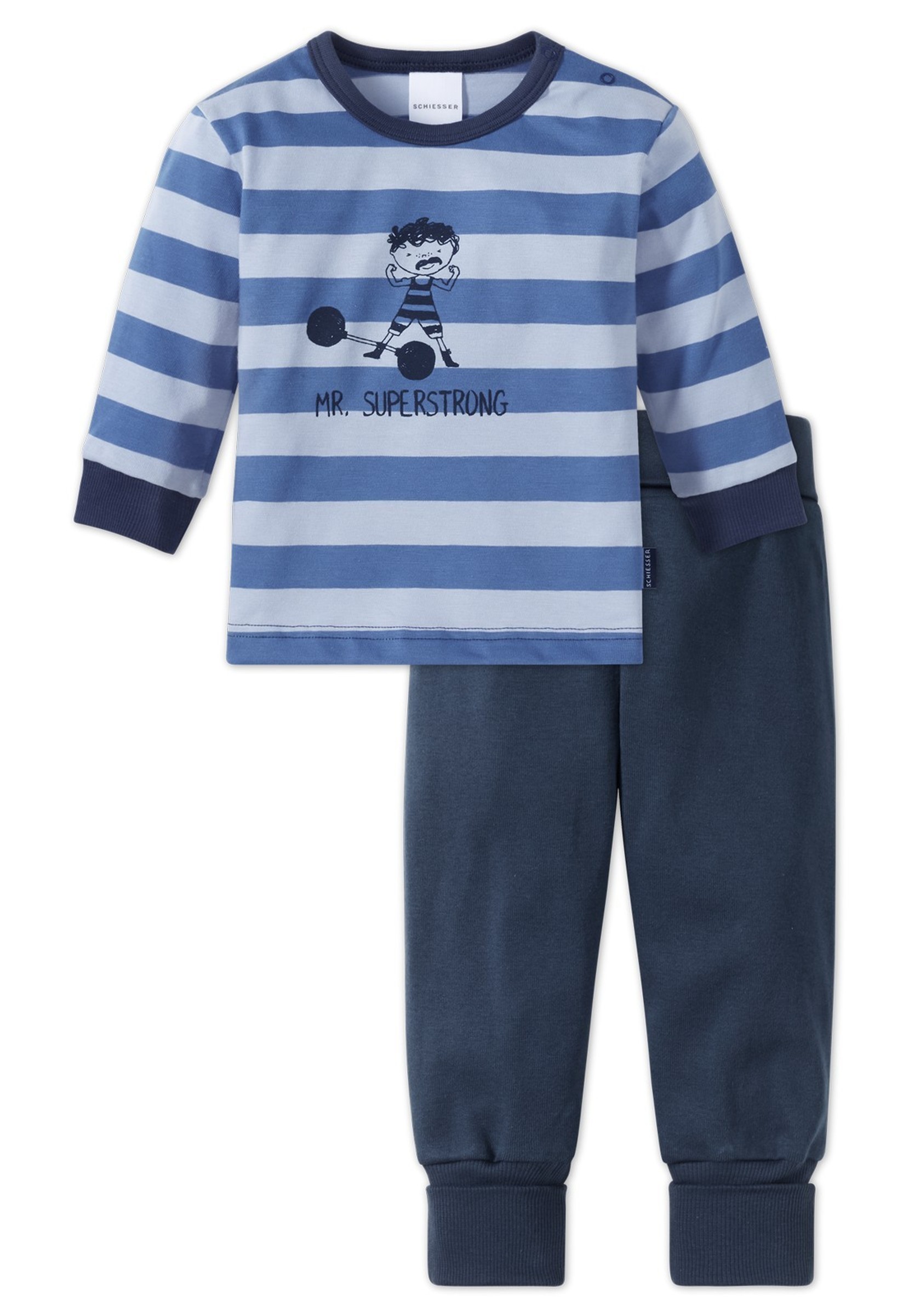 So süß schläft dein kleiner Surfer! Dieser 2-teilige Schlafanzug von Schiesser in 100% Baumwolle ist super weich und bequem. Das coole Design mit der Baby-Schildkröte auf dem Surfbrett, Palmen und dem Schriftzug 'future surf champion' sorgt für gute Laune. Die grün-blau-weiß geringelte Hose und das weiße Oberteil mit blauer Einfassung sehen einfach niedlich aus. Praktische Druckknöpfe an der Schulter machen das An- und Ausziehen ganz easy. Perfekte Schlaftemperaturen garantiert - dein Baby wird sich darin pudelwohl fühlen und süß träumen!
