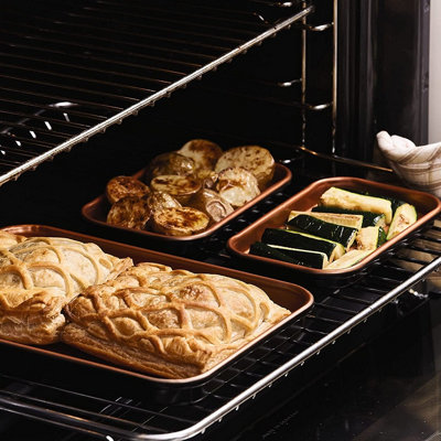 Dieses 2-teilige Emaille Backblech Set von TOPPERFUN ist ein echter Alleskönner in der Küche! Jedes Blech misst 27x19x2,5 cm - perfekt für Pizza, Pfannkuchen, Kuchen oder Ofengemüse. Die Emaille-Oberfläche ist super einfach zu reinigen, kratzfest und hat eine tolle Antihaft-Wirkung. Das Beste: Die Wärme verteilt sich gleichmäßig und schnell, sodass deine Gerichte perfekt gelingen und du sogar Zeit und Energie sparst. Die Backformen sind aus robustem Material, das nicht so leicht beschädigt oder verformt werden kann. Ob süß oder herzhaft - mit diesen Blechen backst du alles, was dir einfällt. Sie sind spülmaschinenfest (bitte Herstellerangaben beachten) und können immer wieder verwendet werden. Ein echter Küchenhelfer, auf den du nicht mehr verzichten möchtest! Perfekt für Familien, Hobbybäcker oder alle, die gerne mal was Leckeres aus dem Ofen holen. Einfach praktisch und vielseitig einsetzbar - diese Backbleche sollten in keiner Küche fehlen!
