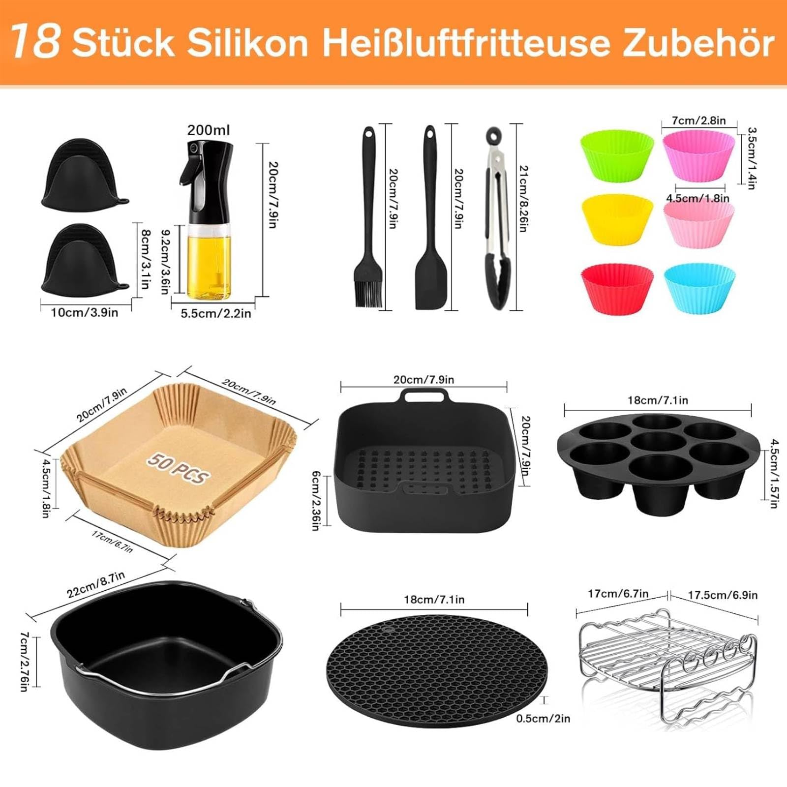 Mach aus deiner Heißluftfritteuse eine echte Multiküche! Dieses umfangreiche Zubehör-Set passt für COSORI 5,5L-6,4L, Philips XXL, Ninja MAX PRO und viele andere Modelle. Enthalten ist alles, was das Kochherz begehrt: 1 Backform, 1 Edelstahl-Grillrost mit 4 Spießen, 1 Silikon-Kuchenform, 50 Backpapiere, 1 Lebensmittelzange, 1 Muffinform, 6 Cupcake-Formen, 1 Ölpinsel, 1 Ölsprüher, 1 hitzebeständige Silikonmatte und vieles mehr. Alle Teile sind aus lebensmittelechtem, BPA-freiem Material und halten Temperaturen bis 230°C stand. Die Antihaftbeschichtung der Backform sorgt für perfektes Herauslösen deiner Kreationen. Ob Kuchen backen, Fleisch grillen oder Muffins zaubern - mit diesem Set sind deiner Kreativität keine Grenzen gesetzt. Die Reinigung ist super einfach - alle Teile sind spülmaschinengeeignet. Einfach auspacken und loskochen - so wird jede Mahlzeit zum Erlebnis!