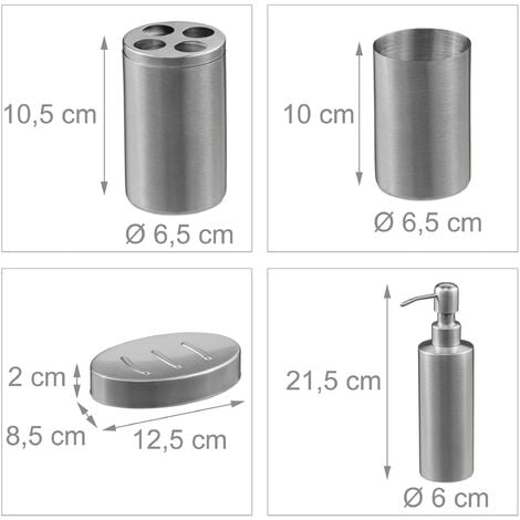 Wow, dieses Relaxdays Badezimmer-Set sieht ja richtig edel aus! 4-teilig aus poliertem Edelstahl in glänzendem Silber - einheitliche Optik garantiert! Enthält: Seifenspender (21,5x6 cm), Seifenschale, Zahnputzbecher und Zahnbürstenhalter! Der Seifenspender fasst ca. 400 ml - muss nicht ständig nachgefüllt werden! Die ovale Seifenschale für feste Seifenstücke - dekorativ und praktisch! Zahnputzbecher zum Mundausspülen - hygienisch und stylisch! Alles aus hochwertigem Edelstahl - rostfrei und langlebig! Leicht zu reinigen - einfach abwischen, kein lästiges Putzen! Passt zu jedem Badezimmer-Stil - ob modern oder klassisch! Macht dein Bad sofort aufgeräumter und gepflegter! Einfach aufstellen und sich über die schöne Optik freuen! Für alle, die Wert auf Details legen - hier bist du genau richtig!