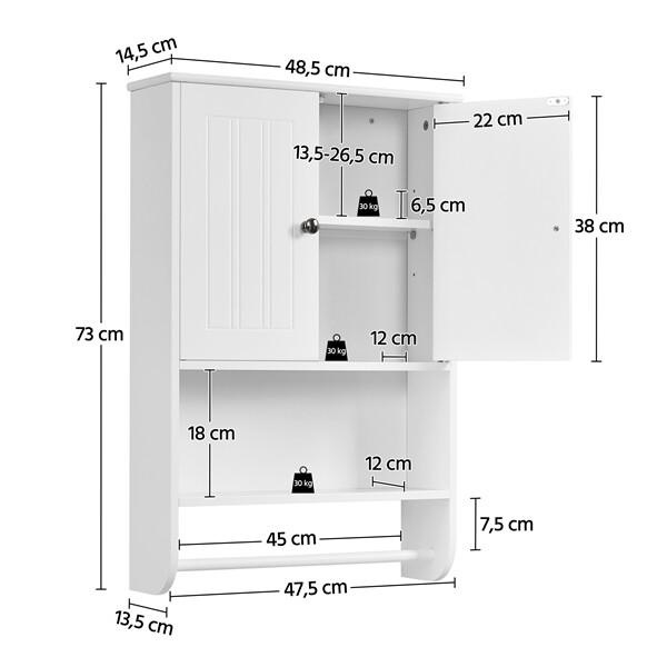 Ordnung im Bad war noch nie so schön! Dieser weiße Wandschrank mit trendigen Lamellentüren bringt Stauraum und Style in dein Badezimmer. Mit 37x20x41cm perfekt für kleine Bäder - nimmt keinen wertvollen Bodenplatz weg. Zwei Ebenen bieten reichlich Platz für Kosmetik, Pflegeprodukte, Duschgel und Shampoo. Drei integrierte Haken an der Unterseite für Handtücher oder Taschen. Aus robuster Holz-Kunststoff-Platte - stoßfest und feuchtigkeitsbeständig. Lüftungsschlitze halten den Schrank trocken. Einfache Montage mit komplettem Zubehör - auch für Laien machbar. Abgerundete Kanten für mehr Sicherheit. Nicht nur fürs Bad, sondern auch für Wohnzimmer oder Küche als stylischer Aufbewahrungsschrank. Modernes Design das überall passt!