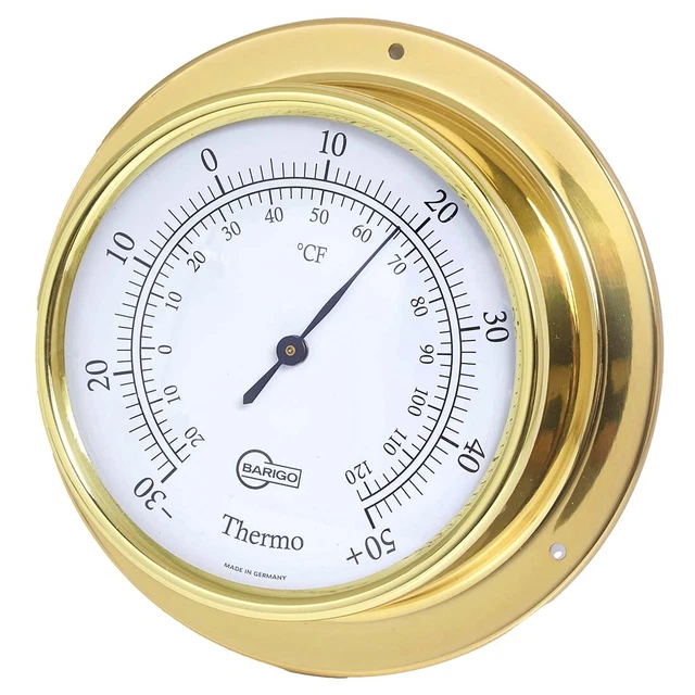 Dieses Barigo Thermometer/Hygrometer ist ein echtes Stück Handwerkskunst! Aus poliertem Messing gefertigt, genau wie die klassischen Instrumente aus der Seefahrt. Mit 110mm Durchmesser ist es ein echter Hingucker an jeder Wand. Zeigt dir zuverlässig Temperatur und Luftfeuchtigkeit an - super praktisch um das Raumklima im Blick zu behalten. Die Skalen sind in englischer Sprache beschriftet, ganz wie es sich für maritime Instrumente gehört. Perfekt für alle, die klassische Qualität zu schätzen wissen. Ob im Wohnzimmer, Büro oder sogar im Boot - dieses Instrument macht überall eine gute Figur. Die Präzisionsqualität sorgt für zuverlässige Messwerte, auf die du dich verlassen kannst. Ein zeitloses Design, das nie aus der Mode kommt. Einfach aufhängen und sich an der hochwertigen Verarbeitung erfreuen - das ist Qualität, die man sieht und spürt!