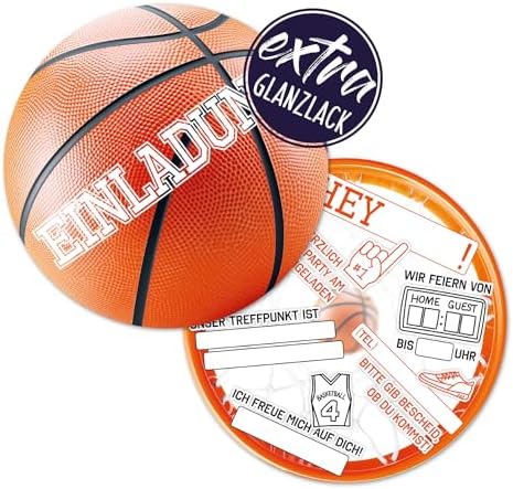 Coole Einladungen für die Basketball-Party! 12 Stück im Pack, jeweils 15cm im Durchmesser - wie ein echter Basketball! Aus super stabilem 400g/m² Papier, in Deutschland klimaneutral gedruckt. Mit vorgefertigten Feldern zum Ausfüllen - geht ratzfatz. Perfekt für Jungs und Mädchen, die Basketball lieben. Einfach Name, Datum, Ort eintragen - und schon kann die Party losgehen. Machen richtig was her und sind viel stabiler als normale Karten. Da freuen sich die kleinen Sportfans!