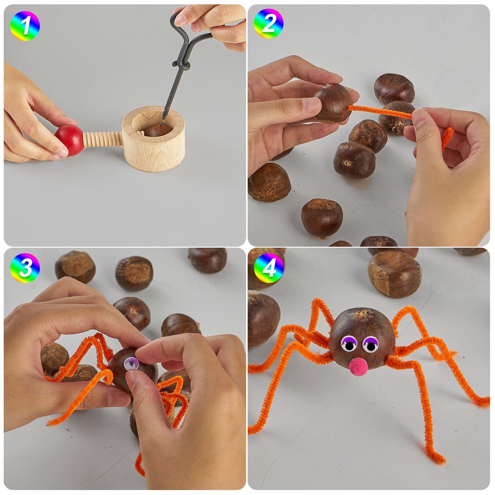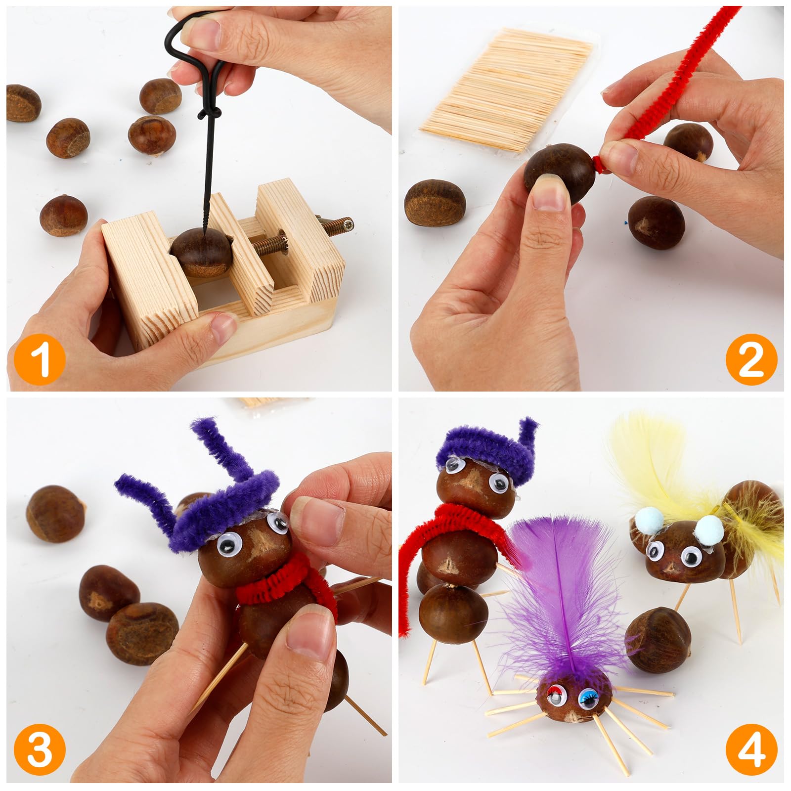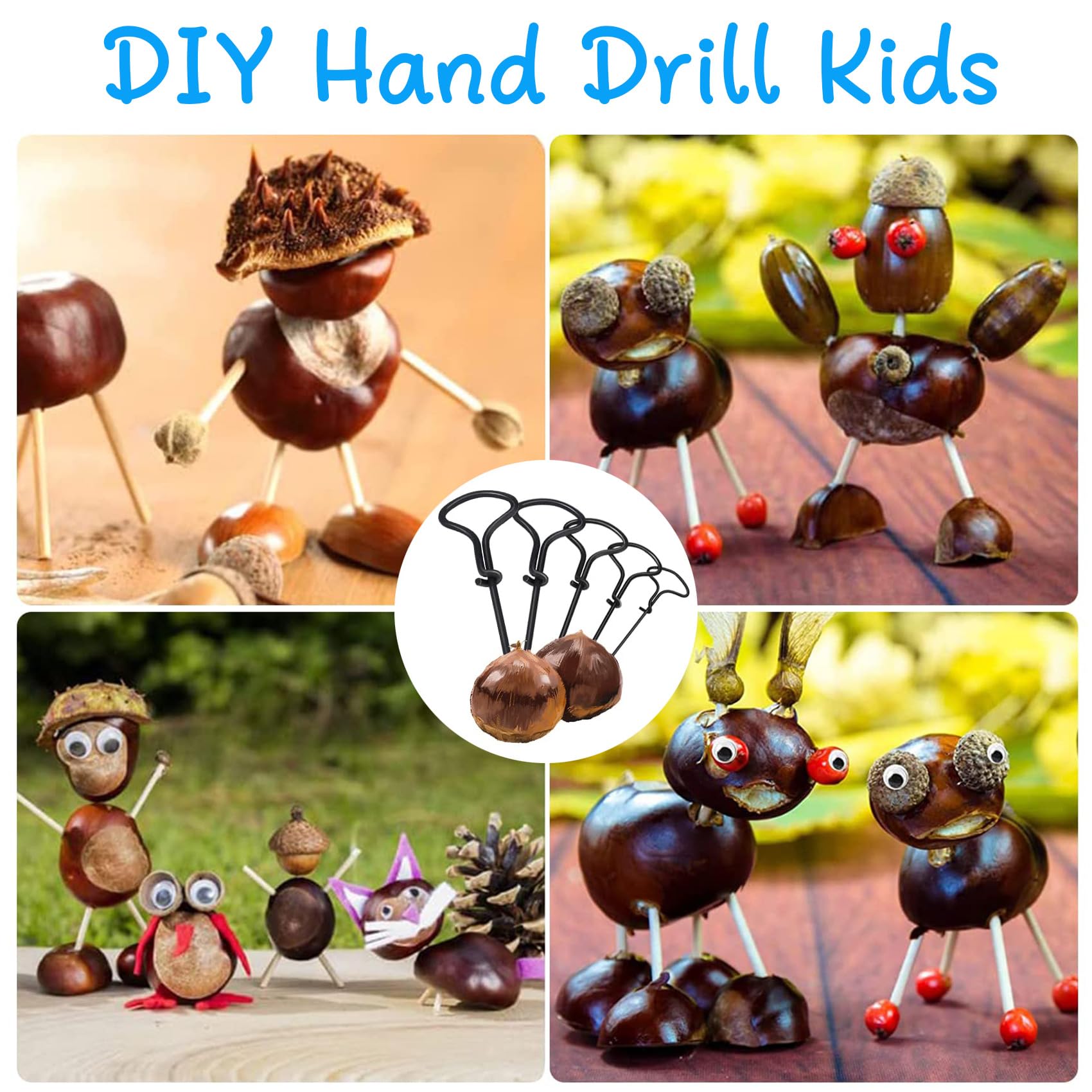 Total süßes Bastelset für Kastanienfiguren! Enthält alles für kreativen Herbstspaß: 1 Kastanienhalter, 5 Handbohrer (1,5-5mm), Federn, Pompons, Wackelaugen, Pfeifenreiniger, Holzzahnstocher, Holzperlen und Schnur. Aus rostfreiem Metall - langlebig und sicher. Fördert die Kreativität und Feinmotorik der Kinder. Perfekt für Familienzeit an Herbsttagen. Einfach Kastanien sammeln und losbasteln! Erstelle niedliche Kastanienmännchen, Tiere oder bunte Herbstketten. Macht riesig Spaß und die Ergebnisse sind wunderbare Herbstdekorationen!