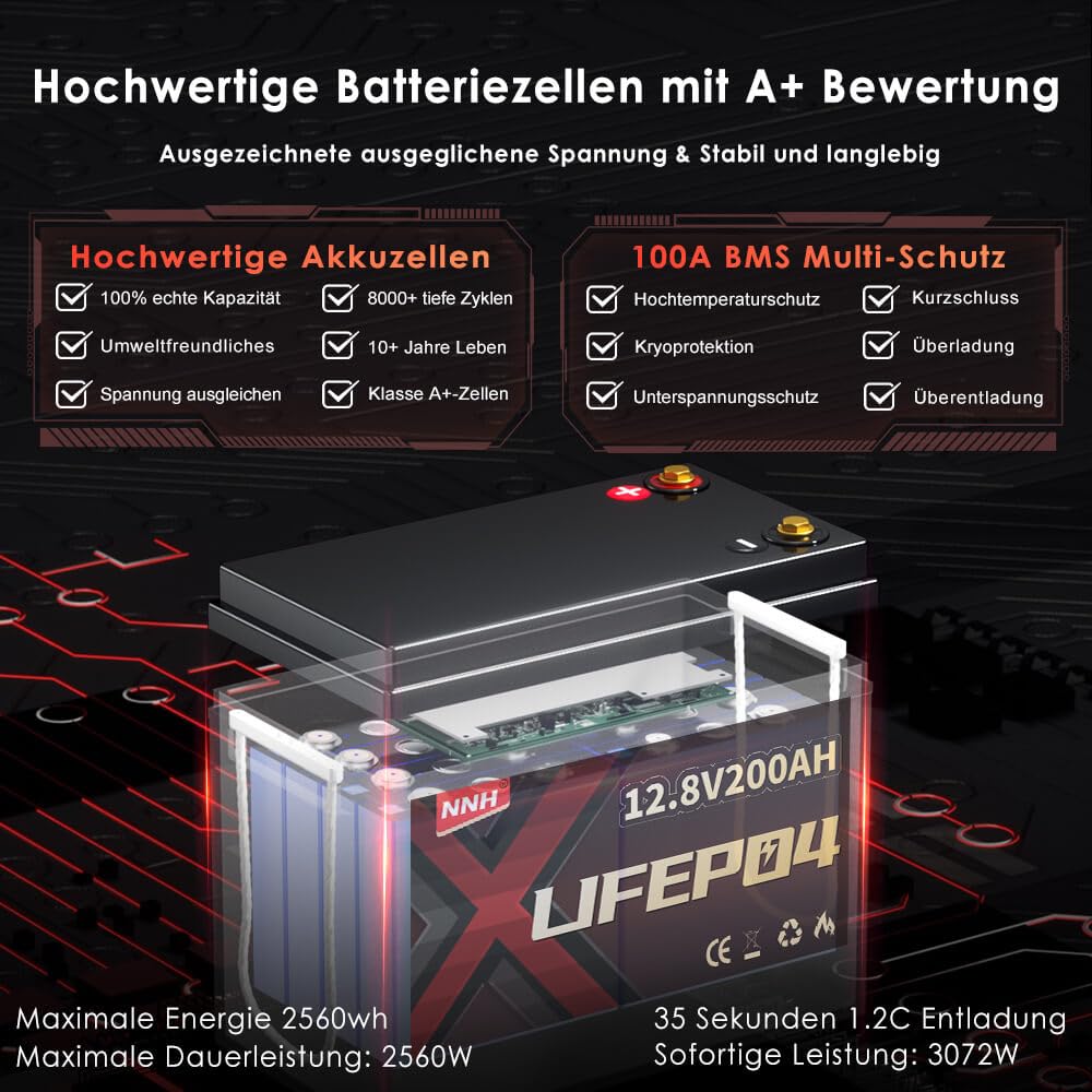 Hey, stell dir vor: Du bist unterwegs und brauchst zuverlässig Strom – genau dafür ist diese Lifepo4 12V 200AH Batterie gemacht! Mit Bluetooth 5.0 checkst du einfach per App den Akku-Status. Sie wiegt nur 18,5 kg, hält aber richtig was aus: Bis zu 8000 Ladezyklen und eine Lebensdauer von über 10 Jahren. Perfekt, oder? 🔋 Ob beim Camping, im Wohnwagen oder für deine Solaranlage – die Batterie liefert konstant Power. Mit 200A BMS ist sie sicher vor Überladung, Kurzschluss und Co. Und wenn du mehr Energie brauchst, kannst du sie mit anderen Batterien kombinieren – bis zu 40,96 kWh! Echt praktisch für längere Trips oder netzunabhängige Projekte. Umweltfreundlich ist sie obendrein, ohne schädliche Schwermetalle. Mit 5 Jahren Garantie und rund um die Uhr Support musst du dir keine Sorgen machen. Einfach laden, anschließen und los!