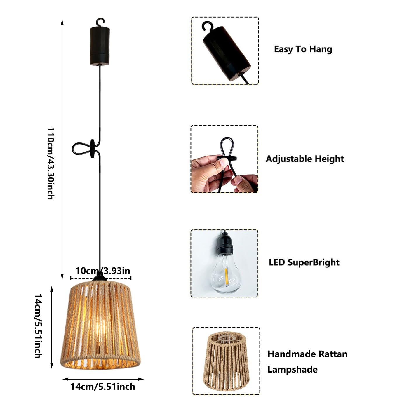 Hey Deko-Enthusiasten! ✨ Diese wunderschöne Boho Hängeleuchte im Rattan-Design bringt gemütliches Flair in jeden Raum - ganz ohne Stromanschluss! Läuft mit 4 AA-Batterien (nicht im Lieferumfang) und hat eine praktische Fernbedienung. Der 25cm große Lampenschirm aus Kunststoff-Rattan ist wasserdicht (IP66) - perfekt für Garten, Terrasse, Balkon oder Zimmer. 💡 E27 Fassung für verschiedene LED-Birnen, 3,7V Niederspannung für absolute Sicherheit. Einfache Installation - einfach Batterien rein und aufhängen! Romantische Atmosphäre für Partys, Abendessen oder gemütliche Stunden. Eine Lampe pro Fernbedienung, aber mehrere kombinierbar. Mit 1 Jahr Garantie und super Kundenservice! Perfekt für alle, die flexibel beleuchten wollen - drinnen und draußen!