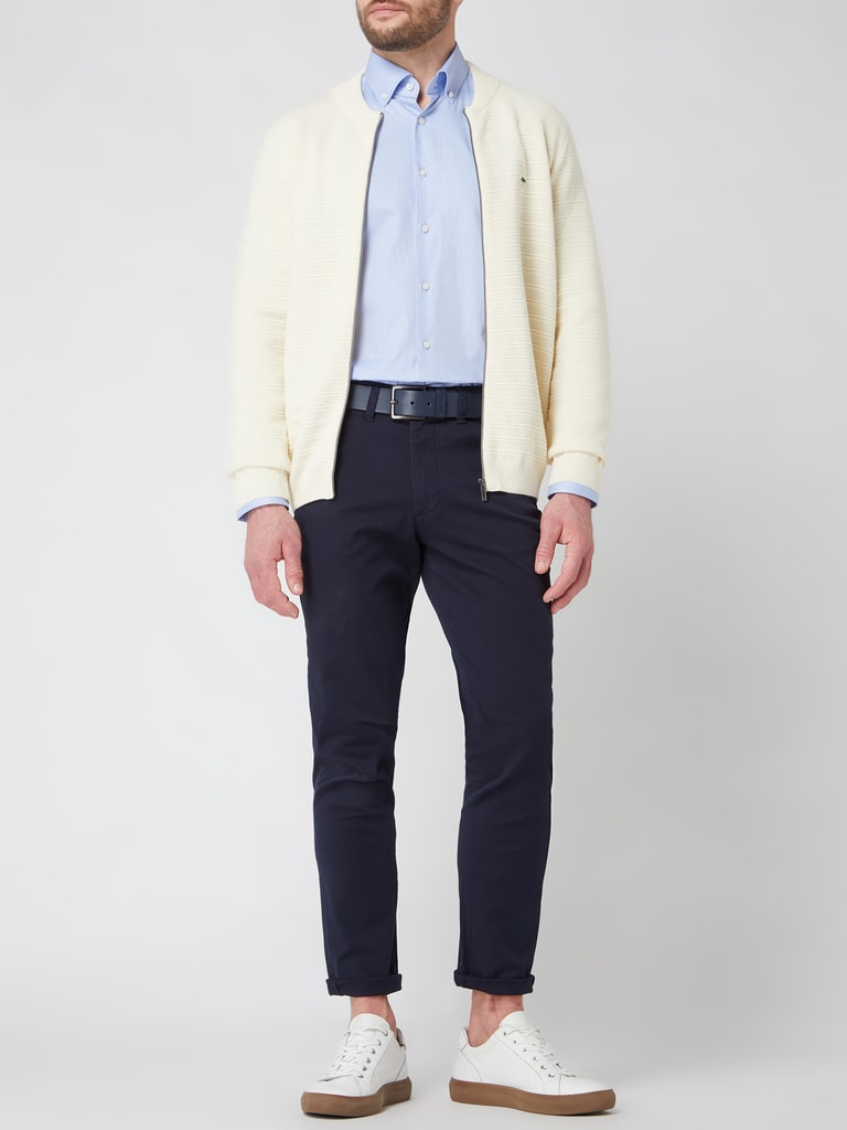 Diese FYNCH-HATTON Strickjacke ist perfekt für den Frühling! Aus 100% Baumwolle mit schöner Struktur und wärmeregulierenden Eigenschaften. Mit Stehkragen, durchgehendem Reißverschluss und Rippstrickbündchen. Casual-Fit und atmungsaktiv - ideal für die Übergangszeit. Logostickerei auf Brusthöhe rundet den Look ab. Einfach stylisch und bequem!
