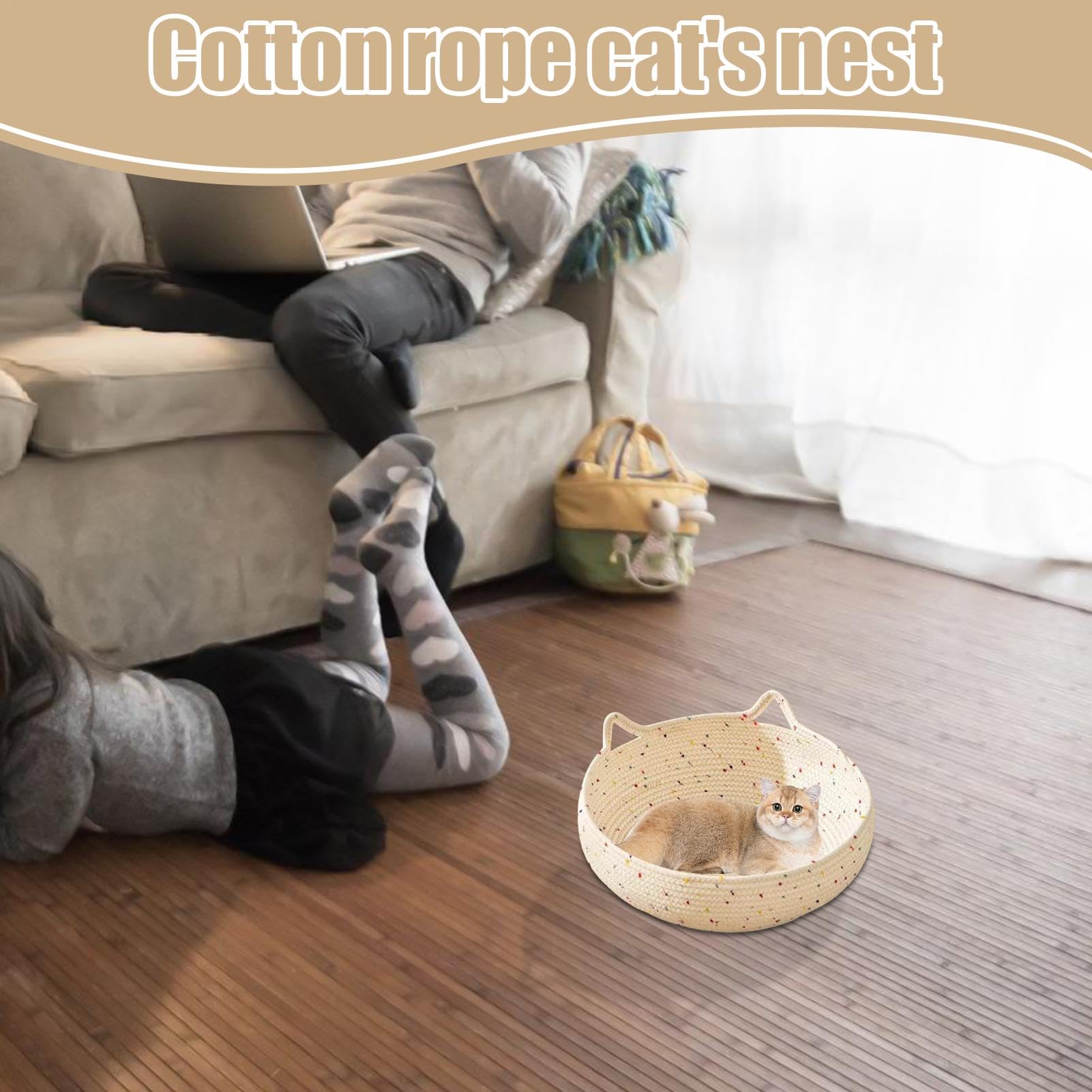 Oh wow, dieses handgewebte Katzenbett ist einfach nur kuschelig! Deine Katze wird es lieben - versprochen! Aus natürlichem Baumwollseil gewebt, ist es super atmungsaktiv und umweltfreundlich. \\n\\nDer erhöhte Rand gibt deinem Stubentiger perfekte Kopf- und Nackenunterstützung. So kann sie sich richtig gemütlich einkuscheln und entspannen. \\n\\nDas rutschfeste Bodendesign ist genial! Egal ob auf Holz, Fliesen oder Laminat - das Bett verrutscht nicht und gibt deiner Katze Sicherheit. Besonders wichtig für ältere Tiere oder Katzen mit Gelenkproblemen. \\n\\nUnd das Material ist richtig robust - hält auch täglichem Kratzen stand ohne kaputt zu gehen. Gleichzeitig sieht es so schön aus, dass es deine Einrichtung aufwertet. \\n\\nPraktisch: Das Bett ist waschbar! Einfach in die Maschine und schon ist es wieder frisch und sauber. \\n\\nNicht nur für Katzen super - auch kleine Hunde fühlen sich darin pudelwohl! Und du kannst es sogar zur Aufbewahrung von Spielzeug oder Decken nutzen. \\n\\nEin multifunktionales Wunderwerk, das deinem Haustier Komfort bietet und dabei noch stylisch aussieht. Dein Vierbeiner wird dieses kuschelige Nest nie wieder verlassen wollen!