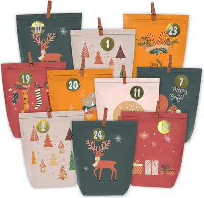 Mach die Vorweihnachtszeit zu etwas Besonderem mit diesem liebevollen Adventskalender zum Selbstbefüllen! Das Set enthält 24 wunderschöne Kraftpapier-Tüten im Retro-Design, 24 Holzklammern und 24 Zahlenaufkleber von 1 bis 24. So kannst du deinen eigenen, persönlichen Adventskalender gestalten - ob mit Süßigkeiten, kleinen Geschenken oder lieben Botschaften. Die Tüten stehen stabil unter dem Weihnachtsbaum oder du hängst sie mit den Klammern an eine Schnur. Ohne Schere oder Kleber bastelst du im Handumdrehen einen einzigartigen Kalender für deine Liebsten. Der klassische Look passt perfekt zur Weihnachtszeit und die Überraschungen bringen jeden Tag Freude. Einfach befüllen, mit den Holzklammern verschließen, Zahlen aufkleben - und schon ist dein persönlicher Adventskalender fertig!