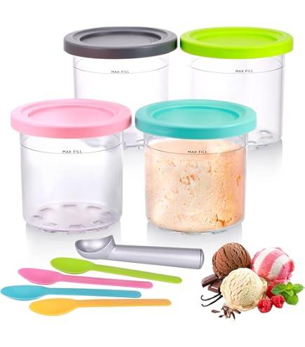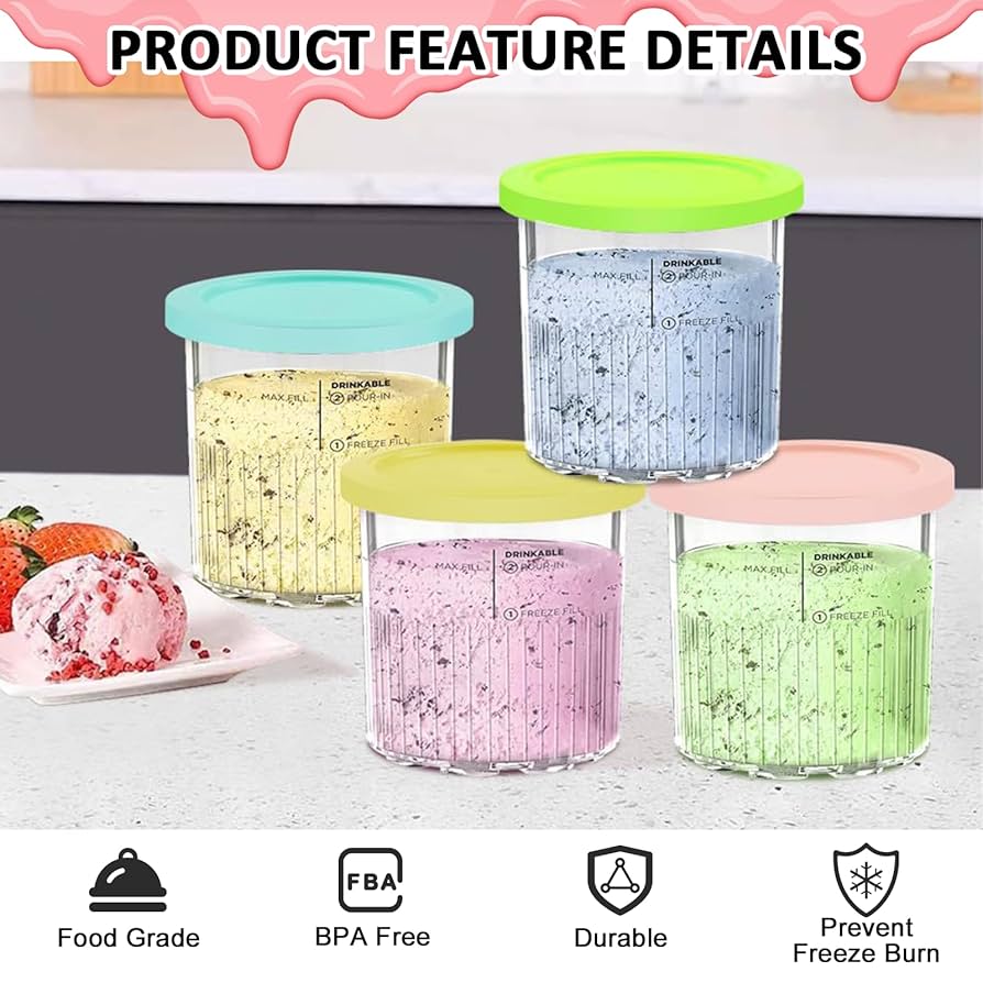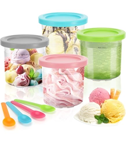 Praktische Ersatzbehälter für deine Ninja Creami! Vier bunte Behälter in Blau, Rosa, Grau und Grün - jeder kann seine Lieblingsfarbe haben. Aus hochwertigem PC-Material, BPA-frei und hitzebeständig von -30°C bis 150°C. Mit luftdichten Deckeln bleibt dein Eis frisch und nimmt keine Fremdgerüche an. Spülmaschinenfest und stapelbar - super praktisch. Inklusive bunte Löffel und einem Aluminiumlöffel. Perfekt für Eis, Sorbet, Frozen Yogurt und Milchshakes. Einfach befüllen (max. 680ml), einfrieren und in der Creami verarbeiten. So hast du immer leckeres selbstgemachtes Eis parat!