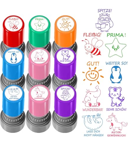 Für Lehrer und Eltern - diese Belohnungsstempel machen Motivation so einfach! 8 verschiedene Motive mit englischen Aufschriften wie 'Excellent!', 'Very Good!' und 'Great Work!'. Selbstfärbend - hält bis zu 30.000 Stempelvorgänge! Mit süßen Cartoon-Designs wie Smileys, Schmetterlingen und Sternen. Perfekt um Schüler zu loben und zu motivieren. Macht das Lernen gleich viel spaßiger! Die Stempel sind ca. 5x2x5,5 cm groß und kommen in einer praktischen Aufbewahrungsbox (18,5x5,5x6,5 cm). Einfach draufdrücken - keine Tinte nötig! Zeigt den Kindern, was sie gut machen und wo sie noch üben können. Ein Muss für jeden Lehrer - damit wird Korrigieren zum Vergnügen!