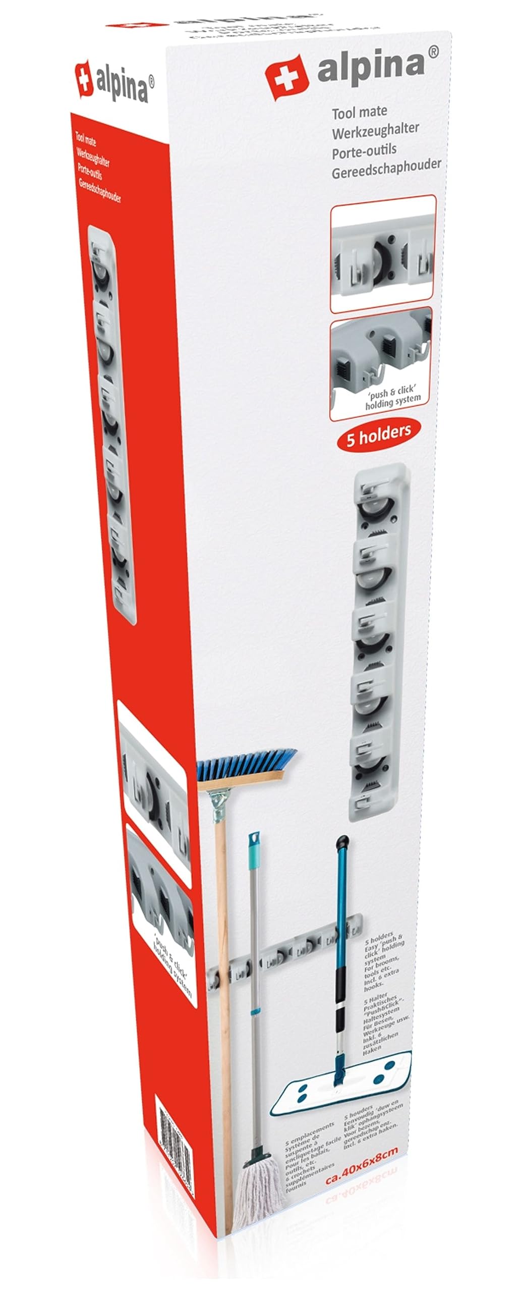 Endlich Ordnung in Garage und Haus! Dieser Alpina Besenhalter mit 5 Öffnungen hält Besen, Wischmopps und Gartengeräte sicher an der Wand. Das praktische Push & Click System macht das Herausnehmen und Einrasten super einfach. Aus robustem Kunststoff in Grau, misst 40x6x8cm. Perfekt für Schuppen, Garage, Hauswirtschaftsraum oder Speisekammer. Nie wieder umfallende Besen oder herumliegende Werkzeuge. Einfach an der Wand montieren und sich über mehr Platz und Ordnung freuen. Der praktische Helfer für mehr Übersicht in deinen Räumen!