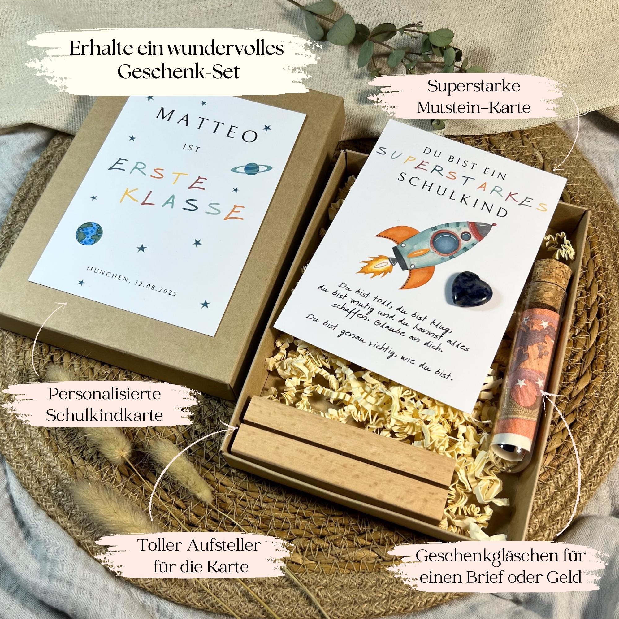 Die Karte mit persönlicher Widmung macht das Geschenk komplett und wird zur bleibenden Erinnerung. Perfekt für Jungen zur Einschulung 2025, als Schulanfänger-Geschenk oder einfach als Glücksbringer für die erste Klasse. Ein Geschenk mit Herz und Bedeutung!