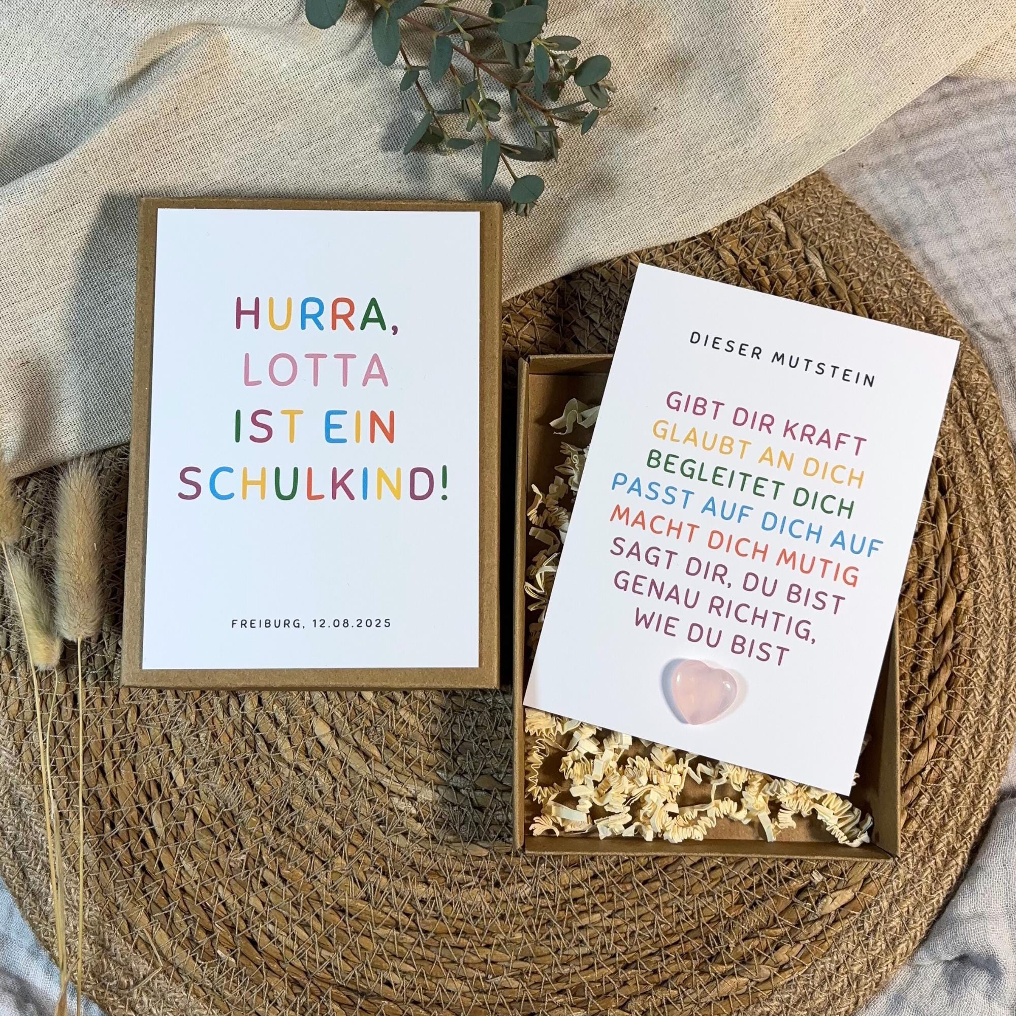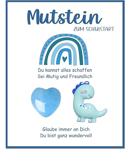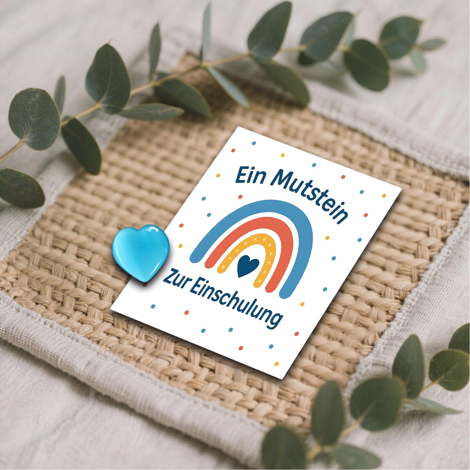 Der erste Schultag ist etwas ganz Besonderes - und dieser Mutstein begleitet dein Kind auf diesem aufregenden Weg! Das Set enthält einen blauen Herz-Mutstein (ca. 3 cm), eine personalisierte Glückwunschkarte (8x8 cm) und eine hübsche Geschenkbox (9x9 cm).