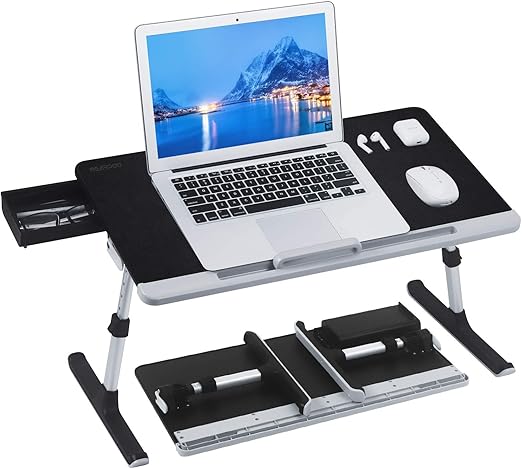 Perfekt für gemütliches Arbeiten im Bett oder auf der Couch! Dieser NEARPOW Laptoptisch ist dein vielseitiger Begleiter für zu Hause. Die Tischplatte passt für Laptops bis 17 Zoll und hat eine schicke Holzoptik. Super praktisch: Die Beine sind in 5 Höhen von 23,9cm bis 32cm verstellbar und die Platte neigbar von 0-36 Grad - alles mit einfachen Verriegelungsknöpfen. Komplett montiert geliefert, also sofort einsatzbereit! Ob als Schreibtisch-Ersatz, Snacktablett beim Fernsehen oder Frühstückstablett im Bett - dieser Tisch kann alles. Die klappbaren Beine machen ihn platzsparend für die Aufbewahrung. Einfach aufstellen, Höhe und Winkel einstellen und loslegen - so macht Arbeiten oder Entspannen im Liegen richtig Spaß!