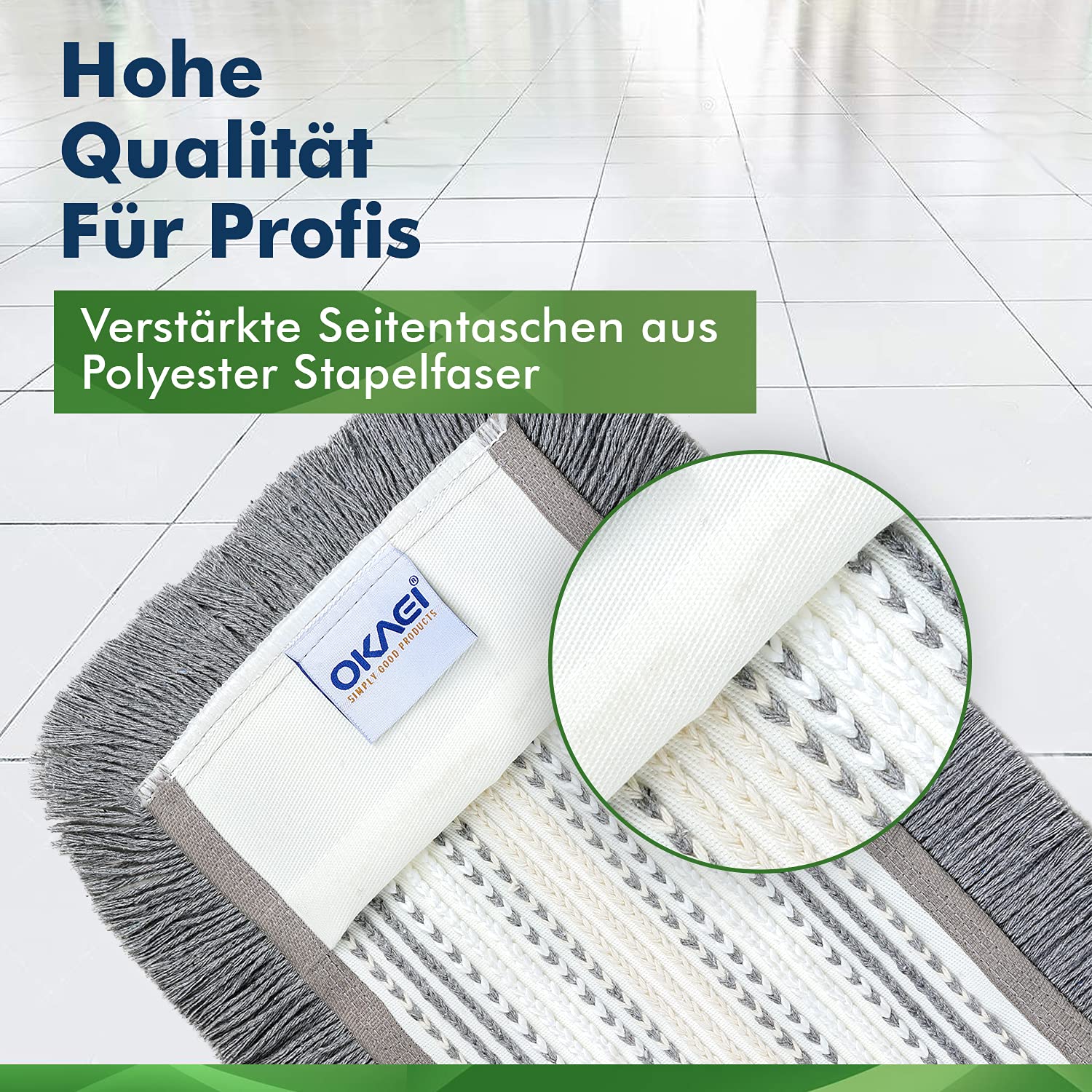 Professionelle Reinigung für Zuhause! Dieser Wischmopp-Bezug von Okaei ist eigentlich für Krankenhäuser und Pflegeeinrichtungen entwickelt worden - und das merkt man der Qualität an. Mit 60cm Breite bedeckst du große Flächen schnell und effizient. Das spezielle Material besteht aus einer Mischung von Edelbaumwolle, Polyester, Super-Microfaser und Rayon - das sorgt für eine extrem gute Wasser- und Schmutzaufnahme. Die Oberfläche gleitet super leicht über den Boden, was das Wischen viel angenehmer macht. Passt auf die meisten gängigen Wischmopp-Halterungen und ist bei bis zu 95°C waschbar - auch nach vielen Waschgängen bleibt die Form und Saugkraft erhalten. Perfekt für Fliesen, Laminat, Parkett und andere Böden. Ob in der eigenen Wohnung, im Haushalt oder gewerblich - mit diesem Bezug wird das Wischen zum Kinderspiel. Die graue Farbe ist praktisch und zeigt Verschmutzungen nicht sofort. Ein echter Profi-Tipp für alle, die Wert auf gründliche Reinigung legen und keine Lust haben, mehrmals über die gleiche Stelle zu wischen!