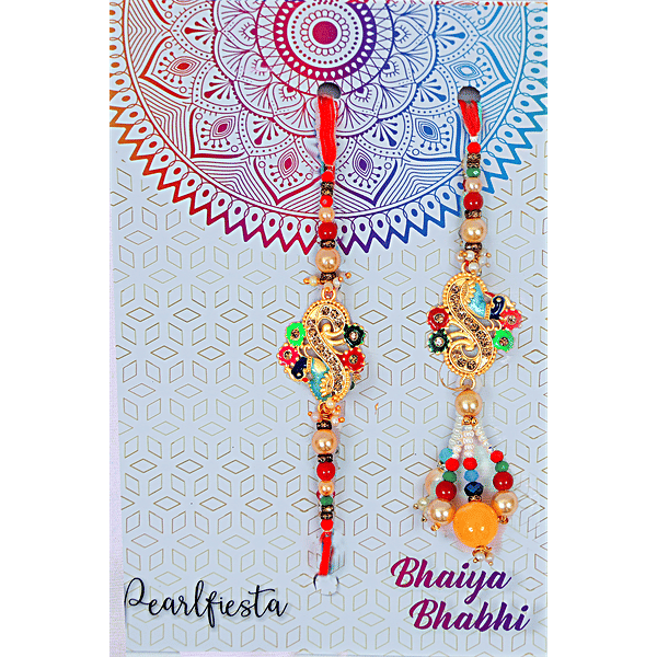 Suchst du das perfekte Geschenk für das Raksha Bandhan Festival? Dieses wunderschöne Rakhi Set von Aditri Creation ist genau das Richtige! Ein Set mit 3 traditionellen Armbändern - eins für den Bruder (Bhaiya), eins für die Schwägerin (Bhabhi) und ein Dora. Handgefertigt in Indien mit Liebe und Segen der Kunsthandwerker. Die Armbänder sind aus Baumwollfaden gefertigt und verziert mit bunten Steinen, Moti, Minakari und Kundan-Anhängern. Jedes Stück ist ein Unikat mit leichten Variationen - genau das macht den Charme von Handarbeit aus! Zum Set gehört auch eine Rakhi-Karte mit Roli Chawal - alles was du für das traditionelle Ritual brauchst. Raksha Bandhan ist das Fest, das die besondere Bindung zwischen Geschwistern feiert. Wenn die Schwester ihrem Bruder das Rakhi umbindet, verspricht er, sie zu beschützen. Mit diesem wunderschönen Set zeigst du deine Liebe und Wertschätzung auf ganz besondere Weise. Ob für deinen eigenen Bruder oder als Geschenk - dieses Rakhi Set macht das Festival unvergesslich. Die liebevolle Verarbeitung und die traditionellen Elemente zeigen, wie wichtig dir diese Beziehung ist. Ein Fest der Liebe und des Zusammenhalts - und dieses Set ist der perfekte Ausdruck dafür!