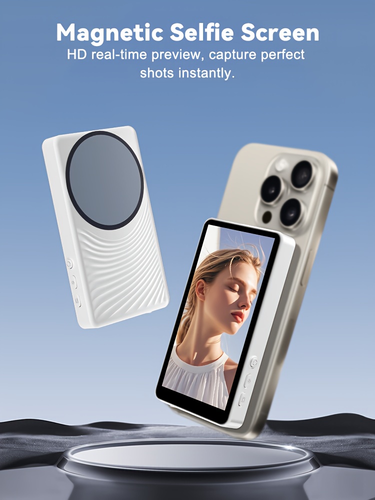 Wow, dieses Teil revolutioniert deine Selfies und Vlogs komplett! Dieser magnetische Selfie-Monitor zeigt dir endlich was deine Rückkamera wirklich aufnimmt - in Echtzeit und gestochen scharf! Mit 4 Zoll Bildschirm und 480x800 Pixel Auflösung siehst du jedes Detail genau. Der Clou: Du siehst dich selbst während der Aufnahme - kein Rumgerate mehr mit der Frontkamera und unscharfen Bildern! Bluetooth-Aufnahme und integrierter Fokus-Regler - alles mit einer Hand bedienbar. Der starke Magnet hält sicher an deinem Smartphone (mit beiliegendem Magnetring) oder Metalloberflächen. Bis zu 30 Meter WLAN-Reichweite - total stabil und ohne Verzögerung! Der 1500 mAh Akku hält 3-4 Stunden - perfekt für lange Live-Streams oder Outdoor-Shootings. Mit Typ-C Schnellladung in ca. 2 Stunden voll. Kompatibel mit den meisten iPhones und Android-Geräten. Perfekt für TikTok, YouTube, Instagram - ob Selfies, Vlogs, Live-Streams oder Gruppenfotos. Leicht und kompakt - passt in die mitgelieferte Tragetasche. Einfach verbinden und professionelle Aufnahmen machen - ganz ohne teures Equipment!