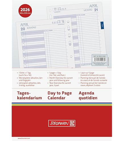Perfekte Organisation für 2026! Dieser bind Tagesplaner im handlichen A5 Format (14,9x21cm) gibt dir jeden Tag eine ganze Seite Platz für deine Termine. Von Montag bis Freitag ist er von 8-18 Uhr durchgetaktet, Wochenenden teilen sich eine Seite. Super praktisch: Er zeigt dir alle Ferientermine der Bundesländer und Feiertage in Deutschland, Österreich und Schweiz. Dazu noch Wochenzählung, Jahresüberblick und Monatsregister - alles was du brauchst! Das Papier ist mit 70g/qm schön stabil und die 6-fach-Lochung passt in die meisten Standardordner. Ob für Büro, Schule oder privat - mit diesem dreisprachigen Kalender (Deutsch, Englisch, Französisch) bist du bestens organisiert!