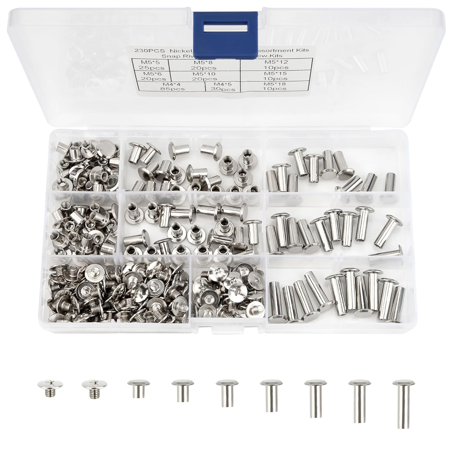 Bastelfreude pur mit diesem 110-teiligen Bindeschrauben-Set! Chicago Schrauben (auch Buchschrauben genannt) in 6 verschiedenen Größen: 20x4mm, 25x5mm, 20x6mm, 15x8mm, 15x10mm, 15x12mm. Aus hochwertiger Metalllegierung - verschleißfest, rostbeständig und wiederverwendbar. Perfekt für Lederarbeiten wie Gürtel, Handtaschen, Schuhe, aber auch für Dokumente, Bücher, Fotoalben oder als dekorative Elemente. In praktischer Aufbewahrungsbox mit Fächern - alles ordentlich sortiert. Mit Schraubendreher und Schlag. Einfach Loch stanzen, Schraube durchstecken und festdrehen. Für alle DIY-Projekte, die eine sichere und stylische Verbindung brauchen!