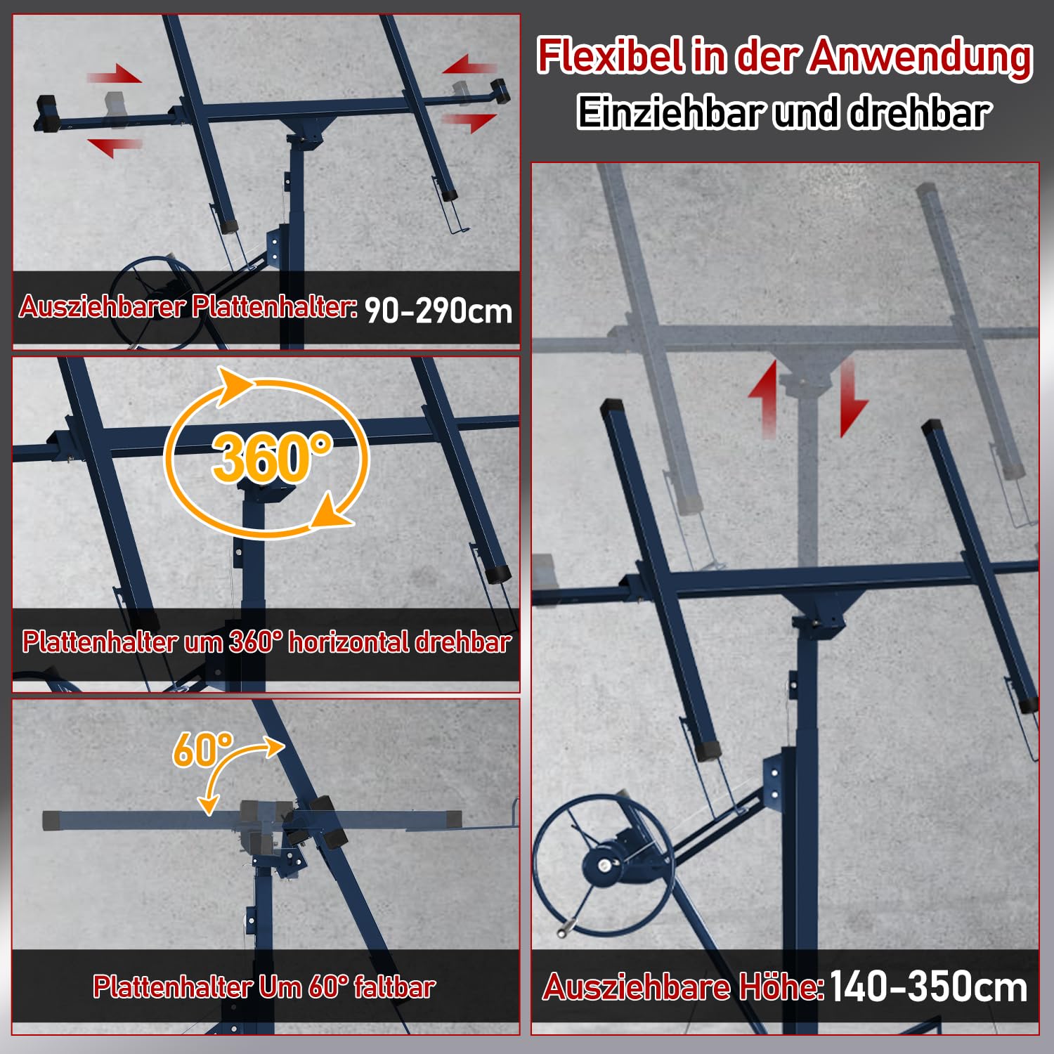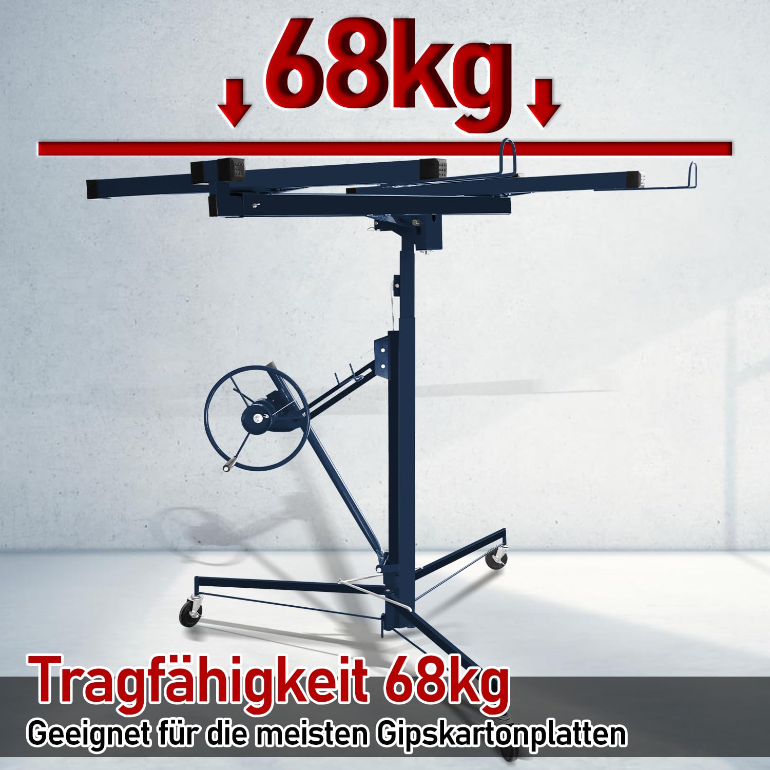 Boah, dieser Plattenheber macht Trockenbau-Arbeiten so viel einfacher! Bis zu 68 kg trägt er problemlos - perfekt für Gipskarton, Spanplatten oder Metallpaneele. Die Arbeitshöhe ist von 140 cm bis 325 cm verstellbar, also für fast jede Deckenhöhe geeignet. Die ausziehbare Plattenaufnahme hat eine maximale Breite von 2,92 m - da passt echt viel drauf. Mit drei Lenkrollen mit Feststellbremsen ist er super mobil und standsicher. Das Beste: Du kannst ihn alleine bedienen! Ob an der Decke, Wand oder sogar Schrägdecken - dank Winkelverstellung ist alles möglich. Wird in zwei Paketen geliefert, also nichts für den kleinen Kofferraum. Ein echter Arbeitserleichterer für Handwerker und Heimwerker. Spart Zeit, Nerven und Rücken! Einfach aufstellen, Platte drauf, hochfahren und befestigen - so einfach kann Trockenbau sein!