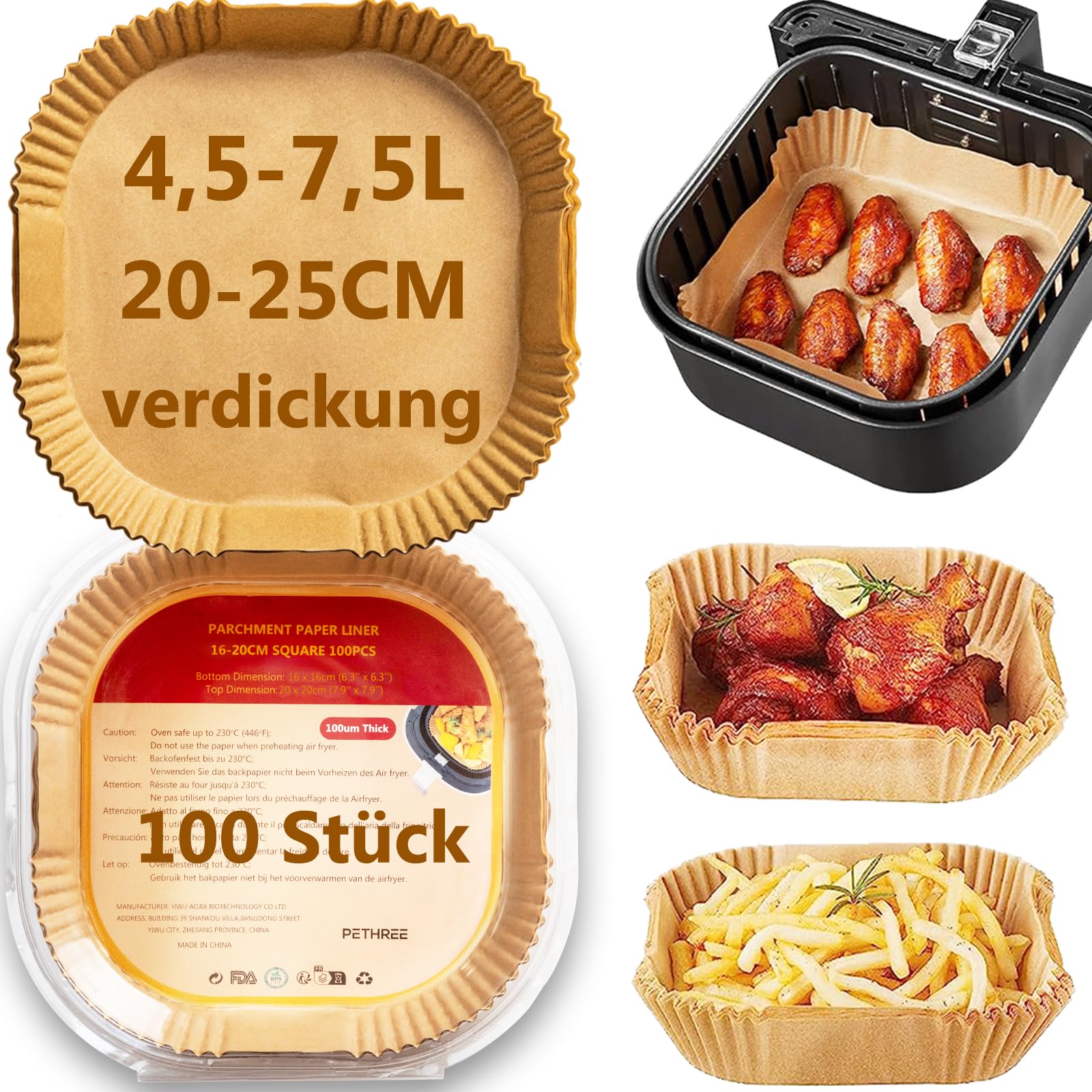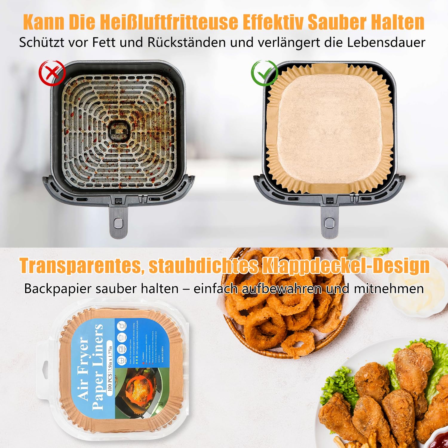 Schluss mit lästigem Putzen! Dieses Airfryer Backpapier macht das Kochen mit der Heißluftfritteuse so viel einfacher. Mit 120 Blättern hast du lange was davon - und jedes Blatt ist BPA-frei und lebensmittelecht.\\n\\nDer 5cm hohe Rand verhindert, dass Fett oder Soßen an den Seiten der Fritteuse kleben bleiben. Dein Essen bleibt da, wo es hingehört - auf dem Papier! Nach dem Kochen einfach das Papier entsorgen und schon ist die Fritteuse sauber.\\n\\nKompatibel mit so gut wie allen Heißluftfritteusen von 4,5L bis 8L - ob Philips, Cosori, Ninja oder Tefal. Passt auch in Backöfen und Mikrowellen - super praktisch!\\n\\nDas verstärkte Papier hält Temperaturen bis 250°C stand - also perfekt für alles, was du in der Fritteuse zubereitest. Ob Pommes, Hähnchen oder Gemüse - nichts verbrennt mehr am Boden!\\n\\nTipp: Beim Vorheizen das Papier noch nicht reinlegen und beim Braten darauf achten, dass das Essen schwer genug ist, damit sich das Papier nicht aufbläht. Ansonsten: Einfach reinlegen, Essen drauf und genießen! Ein echter Game-Changer für alle Airfryer-Fans!