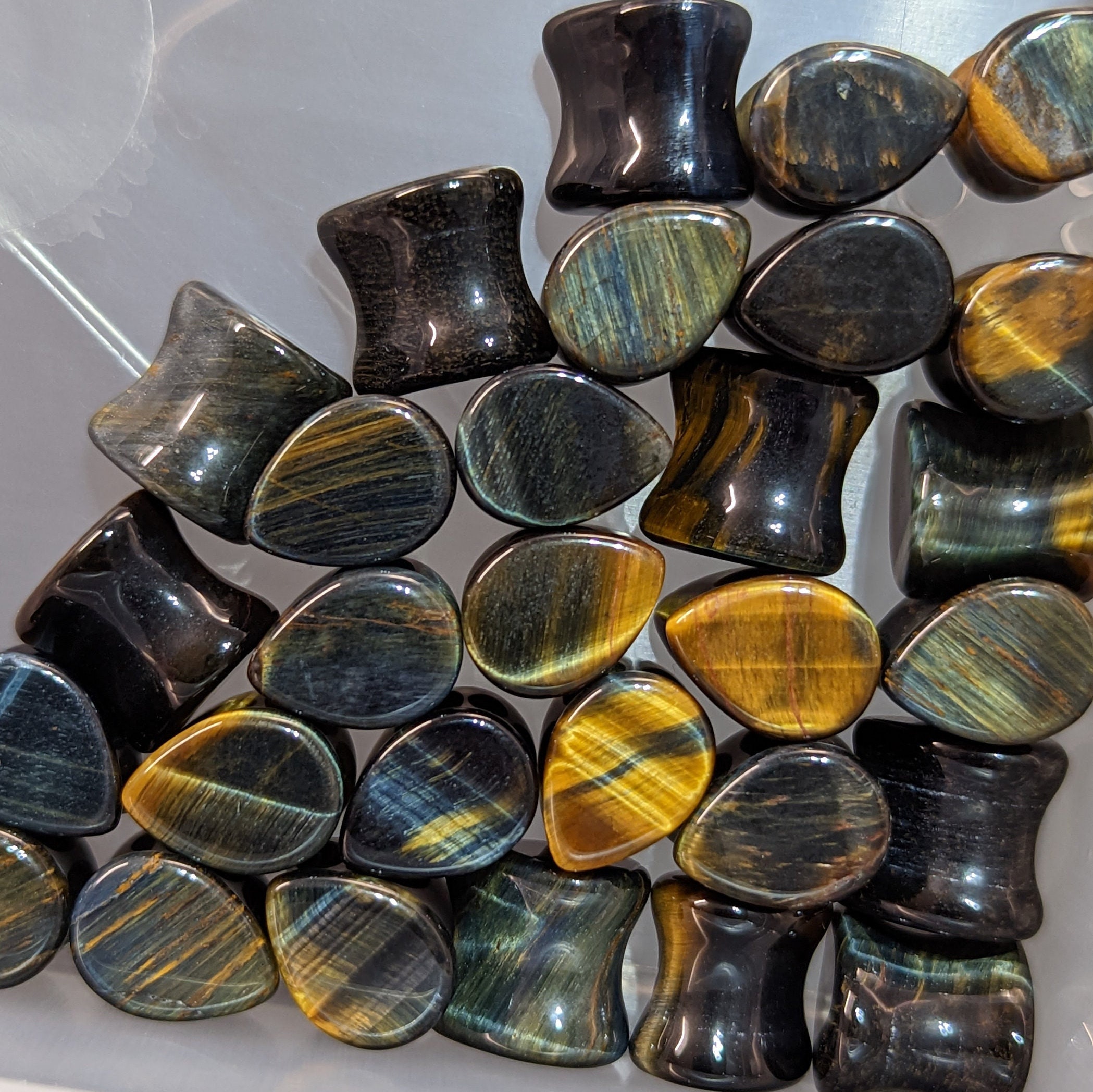Wow, dieser blaue Tigerauge Stecker ist einfach der Hammer! Perfekt für gedehnte Ohren, super glatt poliert und mit praktischem O-Ring zum sicheren Halt. Als Single Flare ist er mega einfach einzusetzen - nur eine Seite ist etwas breiter. Der natürliche Stein sieht einfach klasse aus und jeder Stecker ist ein Unikat. Erhältlich bis 25mm Größe. Wichtig: Wird einzeln verkauft, also für ein Paar einfach zwei bestellen! Wir liefern weltweit und jeder Stecker wird vorher geprüft. Verpasse deinem Style diesen einzigartigen Look - Tigerauge Stecker sind einfach timeless schön!