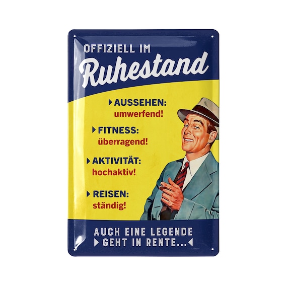 Das perfekte Geschenk für alle frischen Rentner! Dieses witzige RAHMENLOS Blechschild mit der Aufschrift 'Bin im Ruhestand - keine Zeit' bringt jeden zum Schmunzeln. Aus rostfreiem Aluminium in Deutschland gefertigt, mit den Maßen 17x22cm. Die bedruckte und geprägte Oberfläche sieht super hochwertig aus. Mit 4 Befestigungslöchern in den Ecken einfach an der Wand, Tür oder im Gartenhaus zu montieren. Perfekt für die Deko im Partykeller, an der Bar oder in der Küche. Ein lustiges Mitbringsel zur Rentenparty oder ein persönliches Geburtstagsgeschenk. Zeige der Welt, dass im Ruhestand die schönste Zeit beginnt - auch wenn keine Zeit mehr da ist!