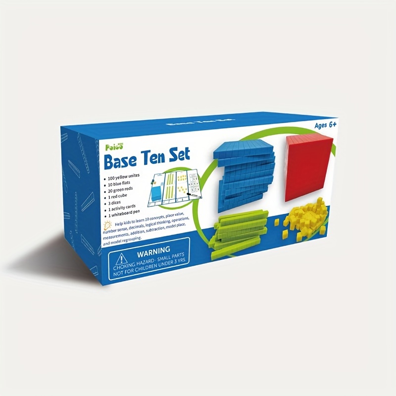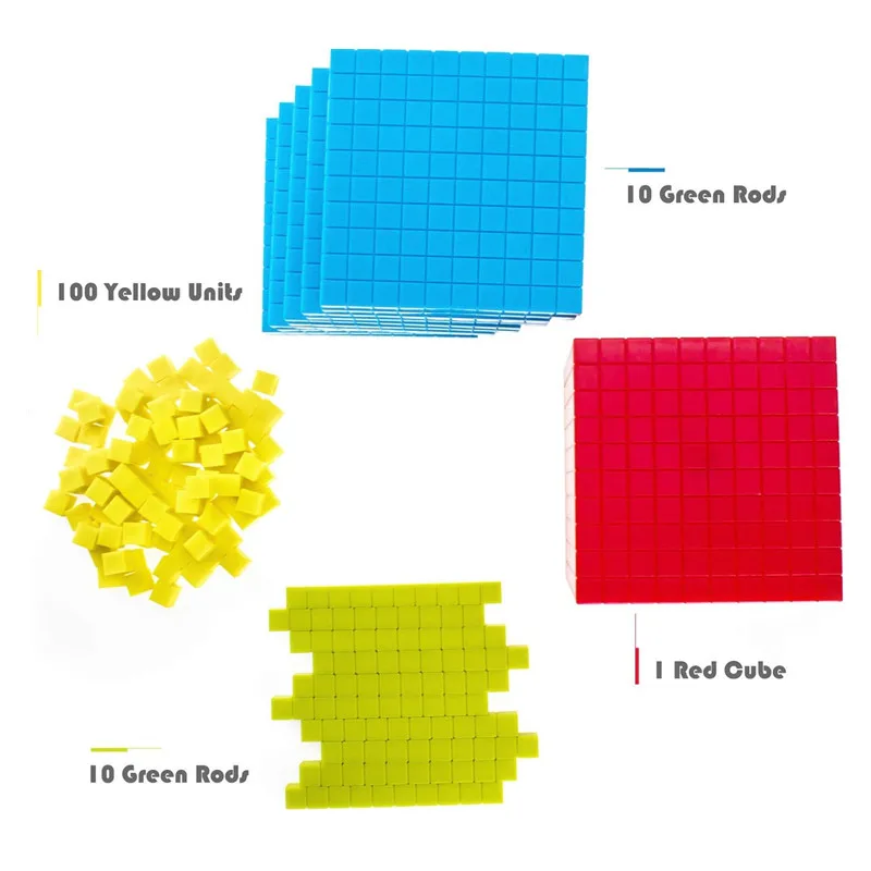 Für Kinder die Mathe lernen: Diese Base Ten Blocks machen Zahlen begreifbar! Im Set sind 121 Teile: 100 gelbe Einer-Würfel, 20 grüne Zehner-Stäbe, 10 blaue Hunderter-Platten und 1 roter Tausender-Würfel. Alles aus sicherem ABS-Kunststoff ohne scharfe Kanten. Mit 23.5x11x11 cm Größe perfekt für kleine Hände. So lernen Kinder spielerisch Zahlen, Stellenwerte und Rechnen. Ideal für Vorschule, Grundschule oder zu Hause. Inklusive Würfel, Stift und Aufgabenkarte für extra Spielspaß. Macht Mathe richtig Spaß!