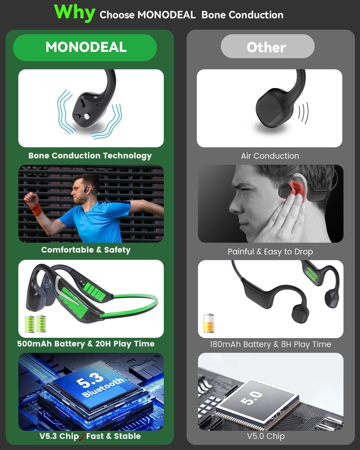 Musik hören und die Umgebung mitbekommen - mit diesen Knochenschall-Kopfhörern geht beides! Perfekt für Sport und Outdoor-Aktivitäten. Die Open-Ear-Technologie bedeutet: keine Ohrstöpsel, die drücken oder schmerzen. Bluetooth 5.3 für stabile Verbindung, IPX6 wasserdicht gegen Schweiß und Regen. Nur 27 Gramm leicht und mit Memory-Metall-Rahmen für perfekten Sitz. Bis zu 8 Stunden Spielzeit und Typ-C-Ladung. Ob joggen, radfahren oder trainieren - du hörst deine Musik und bleibst trotzdem aufmerksam für deine Umgebung. Super bequem, sicher und mit klasse Klangqualität!
