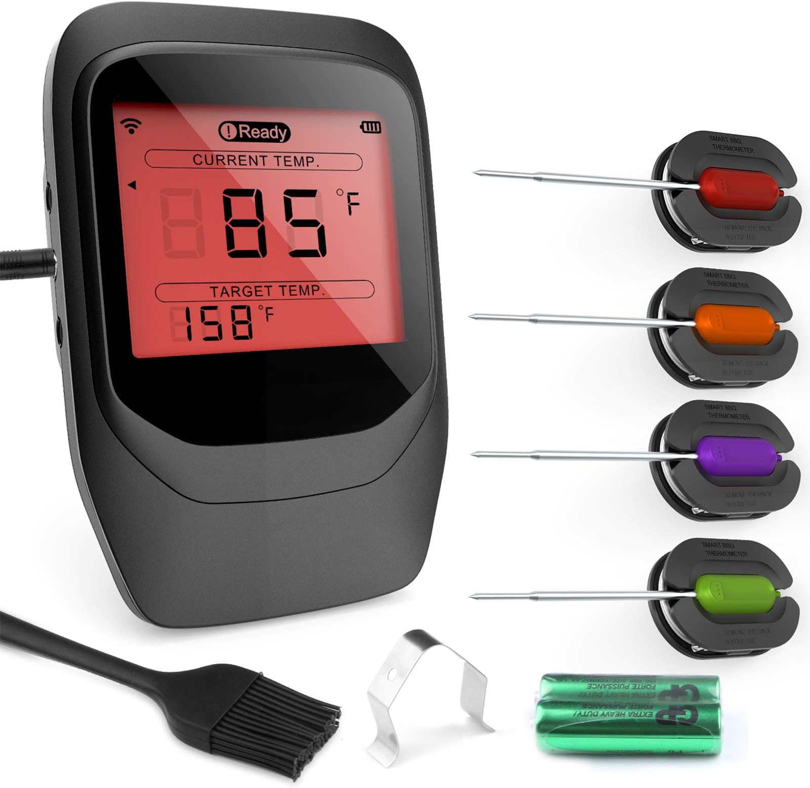 Grill-Profi werden war noch nie so einfach! Das AIRMSEN Fleischthermometer mit Bluetooth 5.4 hat eine Reichweite von 150m - du kannst gemütlich im Wohnzimmer sitzen während es dein Steak überwacht. Zwei Sensoren messen gleichzeitig Kerntemperatur (0-100°C) und Umgebungstemperatur (50-300°C). Super präzise mit ±0,1°C Genauigkeit - dein Steak wird genau so, wie du es magst. Der Akku hält 72 Stunden, lädt in nur 20 Minuten! Die Edelstahl-Sonde ist lebensmittelecht und wasserfest. Das LCD-Display zeigt alles an, die App bietet Profi-Rezepte. Mit magnetischem Standfuß für sicheren Halt. Perfekt für BBQ, Räuchern oder Backen - nie wieder verbranntes oder rohes Fleisch!