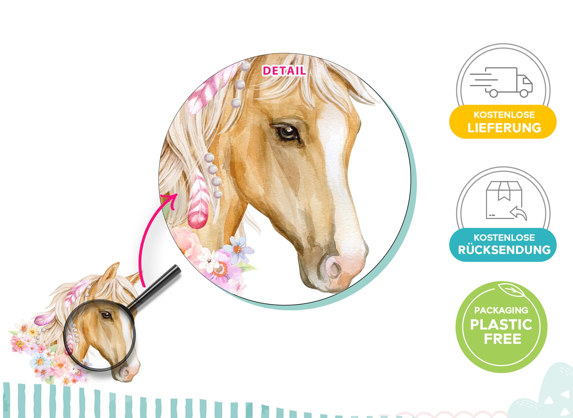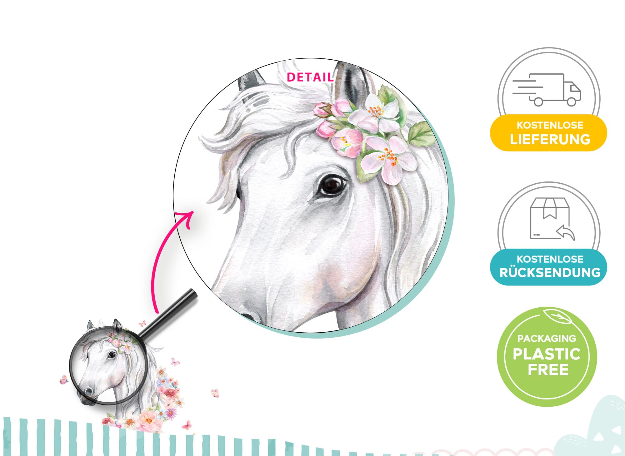 Wow, was für ein süßes Wandtattoo! Dieser Pferdekopf mit Blumen und Schmetterlingen macht jedes Mädchenzimmer zum echten Traumzimmer. Mit 60x52 cm ist es ein echter Hingucker an der Wand. Voll praktisch: Die Aufkleber sind selbstklebend und gehen easy an die Wand - einfach die Trägerfolie abziehen und festdrücken. Wenn du umziehst oder dir was Neues ausdenkst, lassen sie sich rückstandsfrei wieder entfernen. Hält super auf glatten Oberflächen wie Wänden, Türen, Möbeln oder sogar Fliesen. Aus umweltfreundlichen Materialien ohne Chlor und Weichmacher - also völlig unbedenklich für Kinderzimmer. In Deutschland liebevoll von Hand gemacht! Perfekt als Geschenk zur Babyparty oder zum Geburtstag. Schon die Kleinsten freuen sich über die bunten Motive an der Wand. Einfach dekorieren und staunen, wie toll das Zimmer jetzt aussieht!