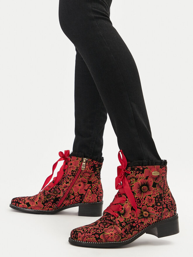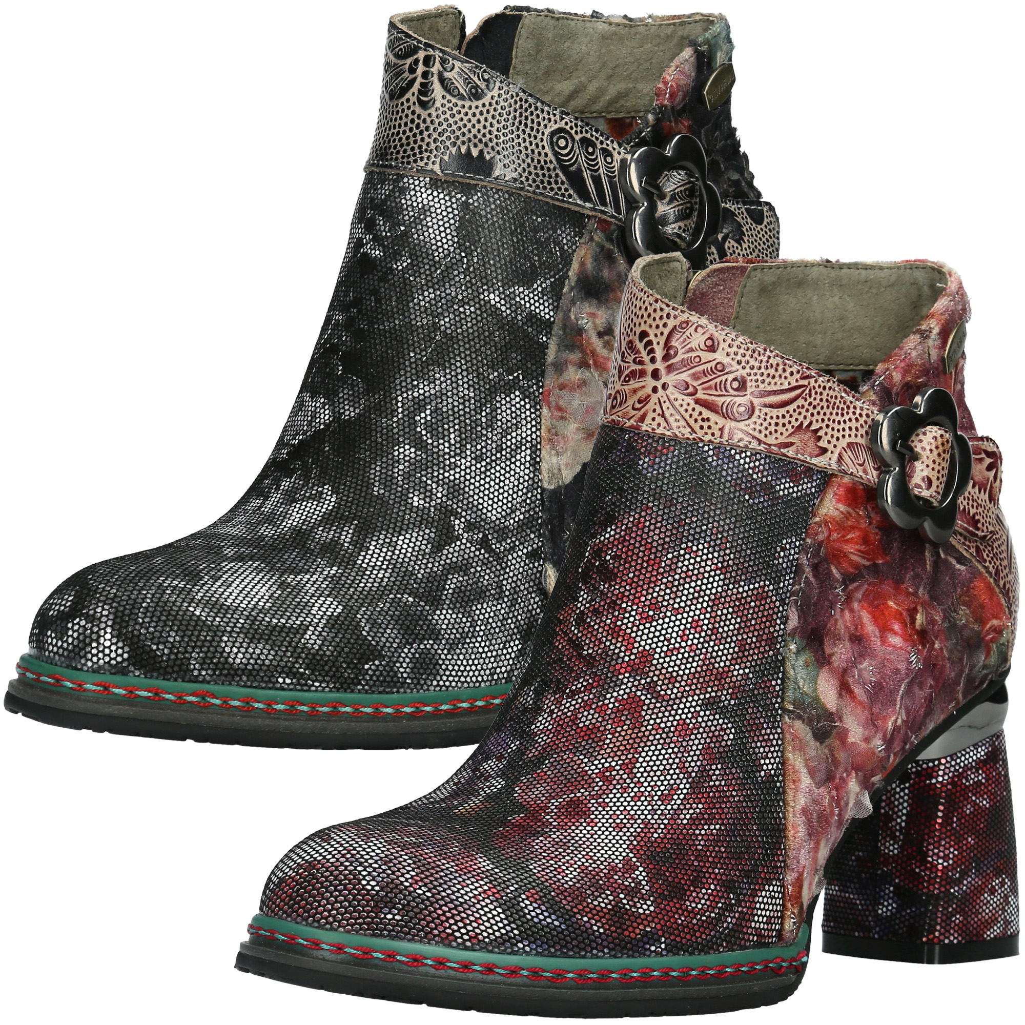 Französische Eleganz für deine Füße! Diese Laura Vita Stiefelette kombiniert Leder-Obermaterial mit nem zauberhaften Blumenmuster und ner floralen Messing-Schnalle. Der 4cm Blockabsatz gibt dir Höhe ohne unbequem zu sein - perfekt für den ganzen Tag. Mit Reißverschluss innen für easy an- und ausziehen. Innen super gemütlich mit Leder-Textil-Futter - deine Füße werden's dir danken. Normale Weite, 12cm Schafthöhe - sitzt wie angegossen. Ob zu Jeans, Kleid oder Rock - macht immer was her. In schwarz, blau oder orange erhältlich - such dir deine Lieblingsfarbe aus! Qualität die man sieht und spürt - nicht nur für besondere Anlässe, sondern für jeden Tag der etwas Besonderes verdient hat. Einfich französisch schick!