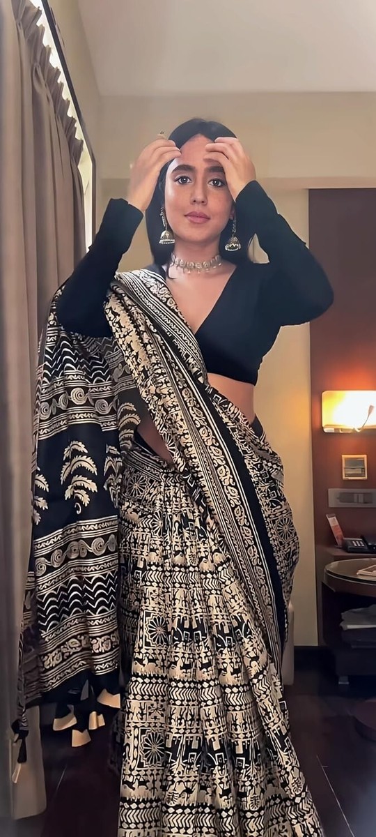 BishtHub Damen Saree Mit Bluse - Baumwolle-Seide Kalamkari Print In Schwarz