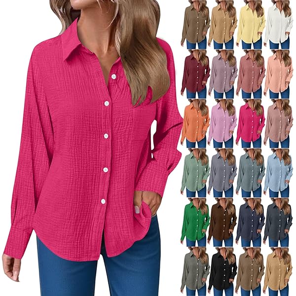 • Damen Musselin Bluse Langarm - Leinenhemd Mit Taschen Aus Baumwolle