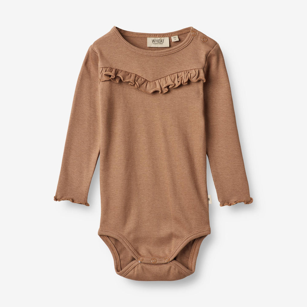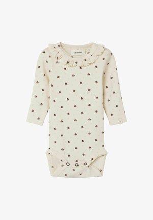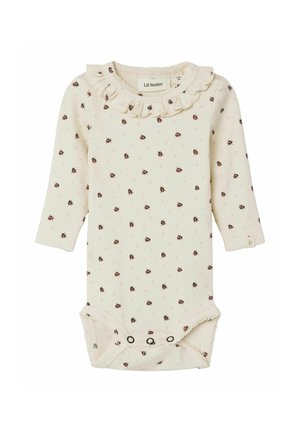 Langärmlig mit süßen Rüschen an den Manschetten. Druckknöpfe an Schulter und Schritt - super praktisch beim Anziehen.