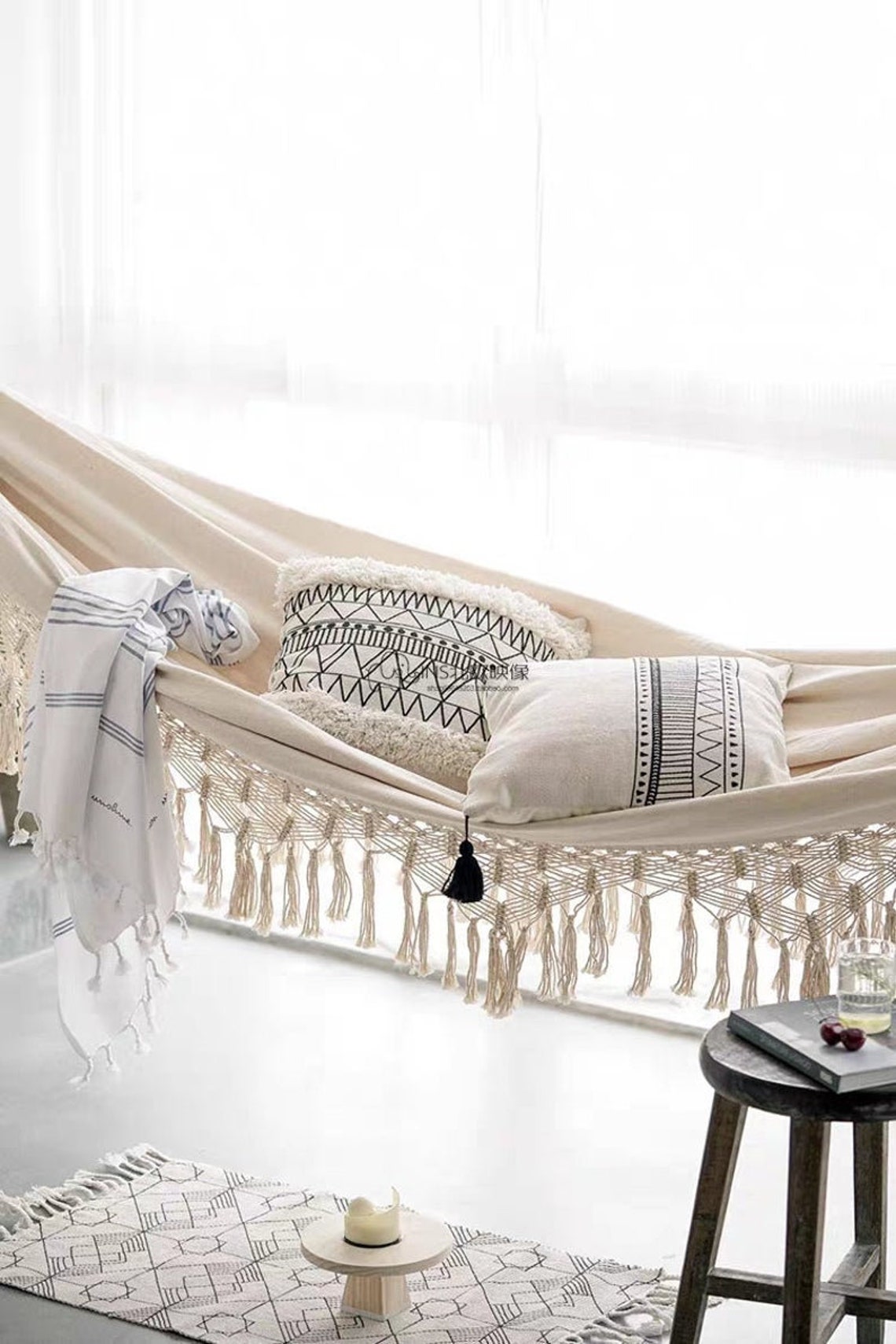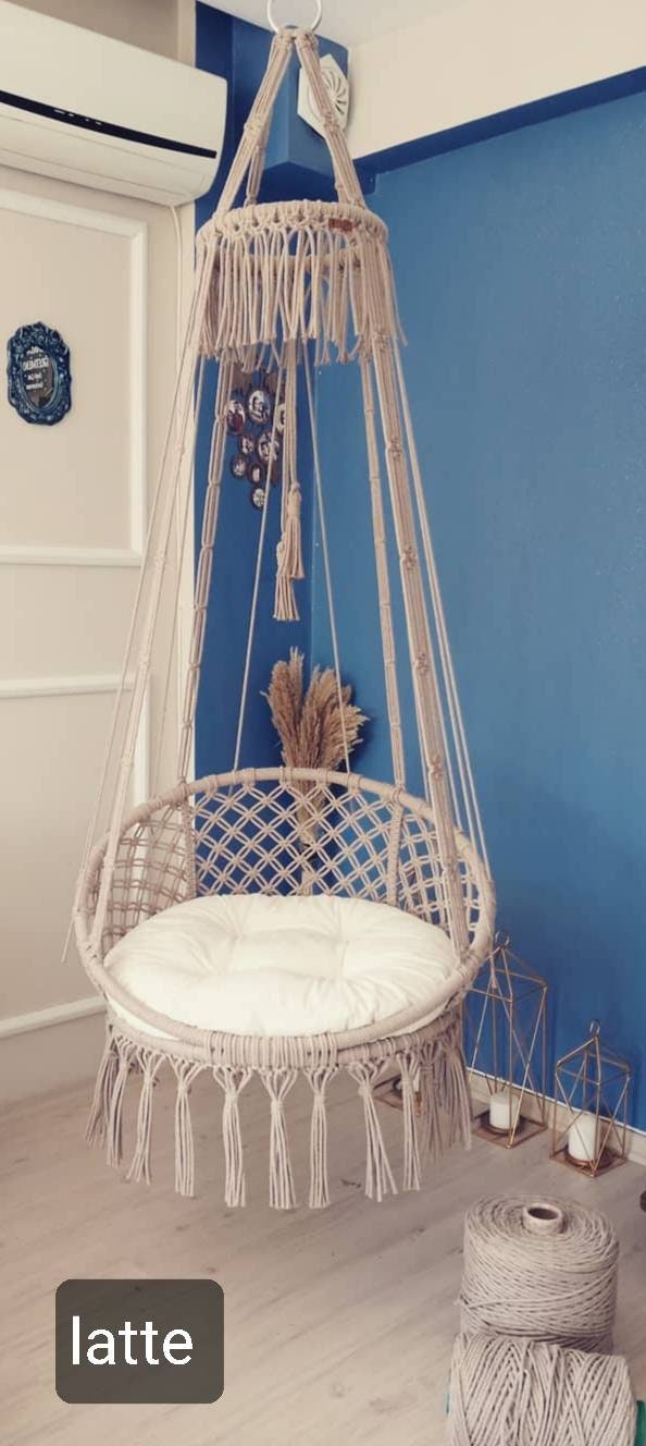 Träumst du von einem gemütlichen Rückzugsort? Dieser handgefertigte Makramee-Schaukelstuhl verwandelt Balkon, Terrasse oder Wohnzimmer in eine Wohlfühloase! Aus hochwertigem Baumwollseil und stabilem Metallrahmen gefertigt. Leicht, tragbar und einfach zu installieren. Perfekt zum Entspannen, Lesen oder Träumen. Der boho-chic Look passt in jedes Interior und verleiht deinem Zuhause individuellen Charme. Ein besonderes Geschenk für Liebhaber handgearbeiteter Unikate. Schaffe dir deine persönliche Auszeit - stylisch, bequem und voller Gemütlichkeit!
