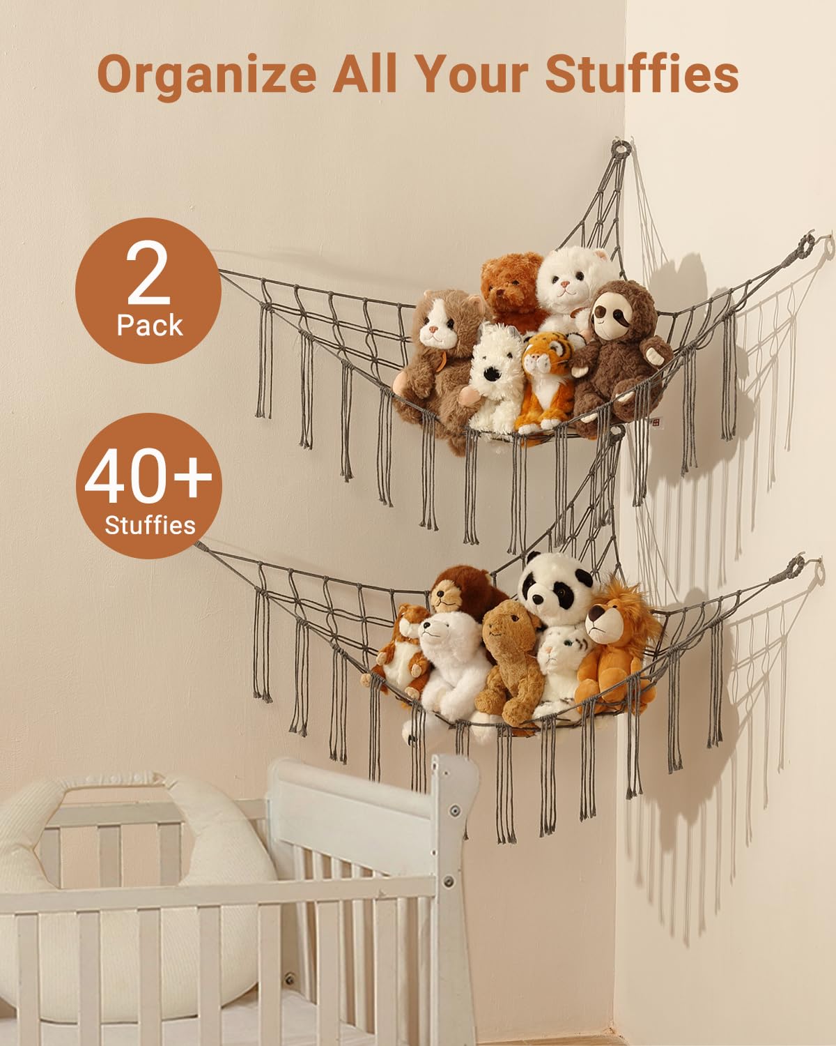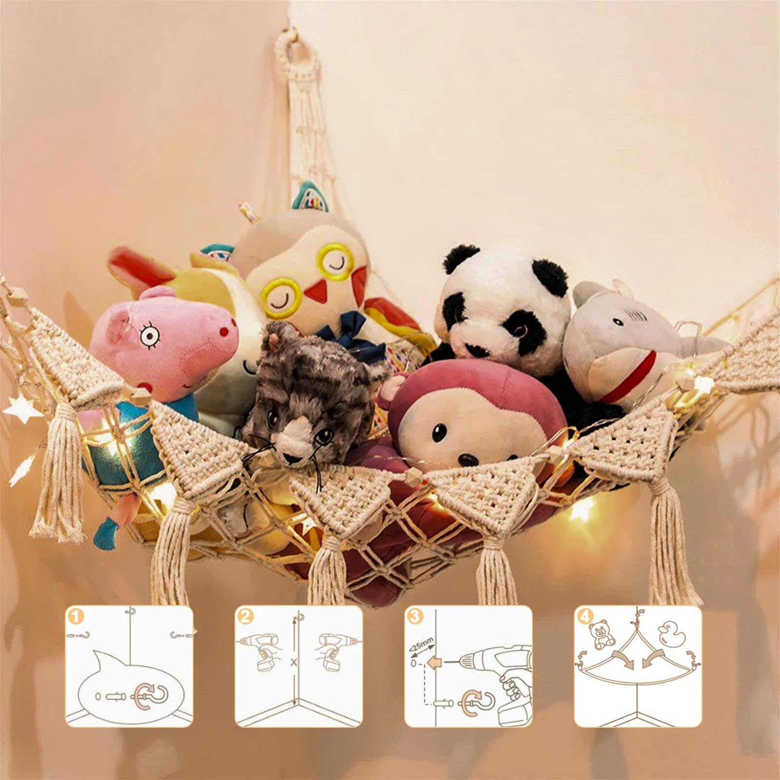 Die Kuscheltiere deiner Kinder nehmen überhand? Dieses Aufbewahrungsnetz Set bringt Ordnung ins Chaos! Du bekommst 2 Netze aus Baumwollseil (je 2 Meter lang) plus 40 bunte Klammern in verschiedenen Farben. Super einfach zu installieren - horizontal oder vertikal an der Wand, die Clips selbst zusammenstecken. So werden Plüschtiere, aber auch Fotos, Socken, Mützen oder Weihnachtskarten ordentlich aufgehängt und platzsparend verstaut. Das Boho-Design in Beige mit Holzringen sieht dazu noch richtig stylisch aus! Robust und langlebig hält das Netz auch viele Kuscheltiere aus. Perfekt für Kinderzimmer, aber auch in Schulen, Büros oder Geschäften einsetzbar. Endlich mehr Platz im Zimmer und alles schön ordentlich - und die Kids finden ihre Lieblingstiere sofort wieder!