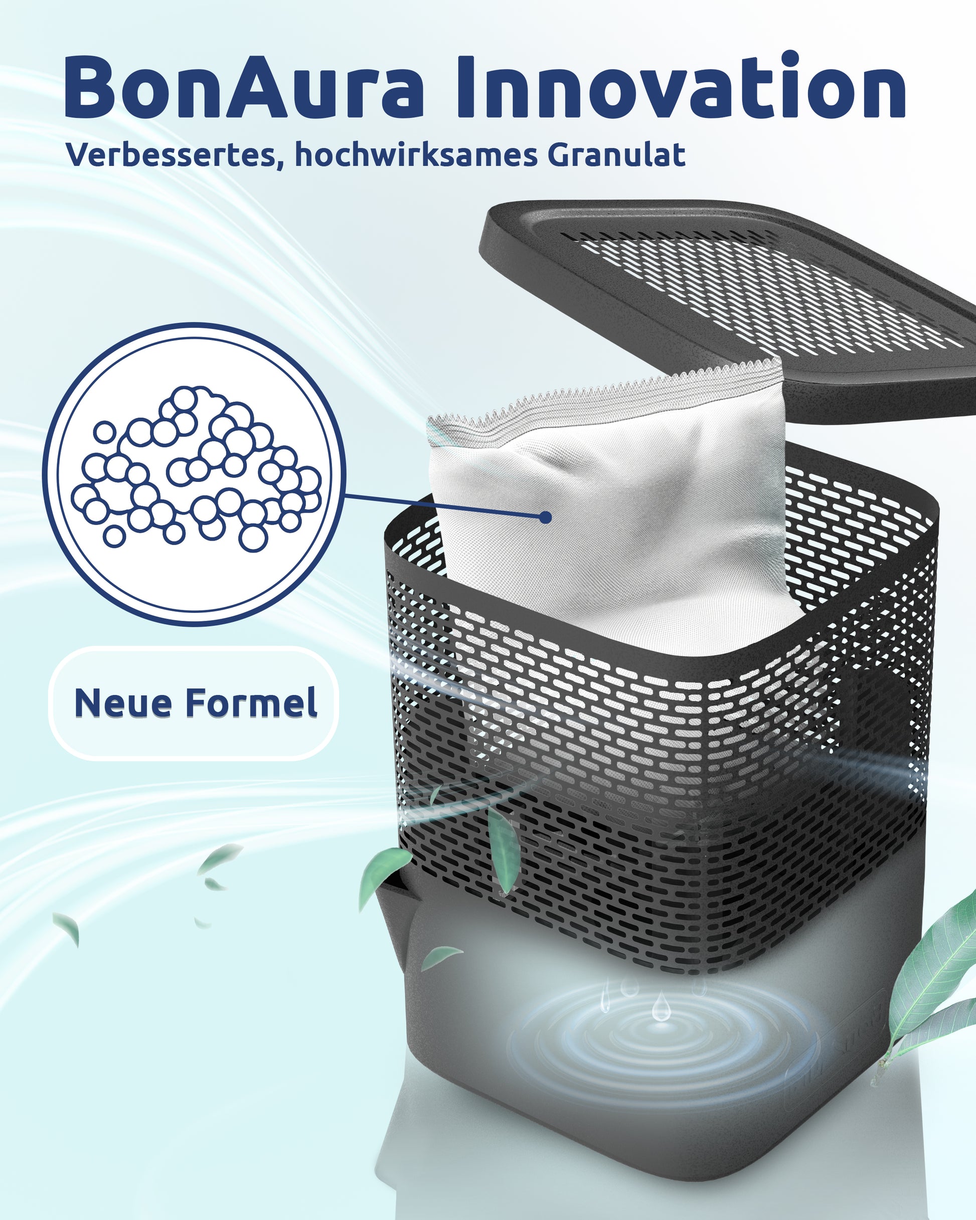 Schluss mit feuchter Luft und muffigen Gerüchen! Dieses BonAura Nachfüllpack mit 4x450g Granulat ist deine Lösung gegen zu viel Feuchtigkeit in der Luft. Einfach in deinen BonAura AirOne Luftentfeuchter füllen und schon saugt das Granulat die überschüssige Feuchtigkeit aus der Luft. Perfekt für Räume bis 16m² - ob Schlafzimmer, Bad, Keller oder Wohnwagen. Das Granulat wirkt nicht nur gegen Feuchtigkeit, sondern beugt auch Schimmelbildung vor und neutralisiert unangenehme Gerüche. Super praktisch beim Wäschetrocknen, nach dem Duschen oder Kochen. Ohne Stromverbrauch - umweltfreundlich und kostensparend! Das 4er-Set spart bares Geld gegenüber Einzelkäufen. Einfach die Beutel öffnen, ins Gerät füllen und sich über ein angenehmes Raumklima freuen. Deine Wände und Möbel werden es dir danken!