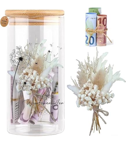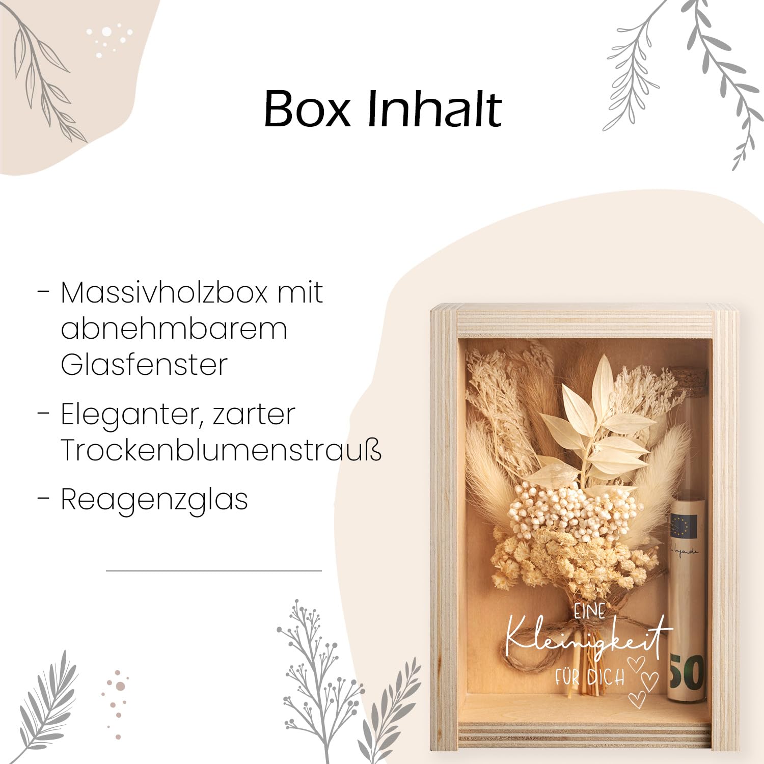 Geldgeschenke mal anders! Diese wunderschöne Geschenkbox verwandelt langweilige Geldscheine in ein kreatives Präsent. Enthalten: Holzkiste, transparentes Reagenzglas für das Geld und zarte Trockenblumen für den besonderen Look. Perfekt für Geburtstage, Hochzeiten oder andere besondere Anlässe. Die Box kann später als Schmuckkästchen weiterverwendet werden. Einfach das Geld im Reagenzglas platzieren, Blumen arrangieren - schon ist das perfekte Geschenk fertig. Viel mehr als nur Geld - eine liebevolle Aufmerksamkeit!