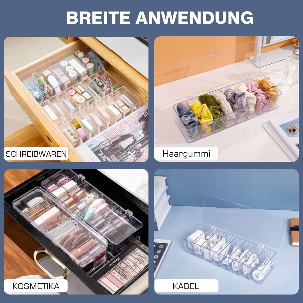 Endlich Ordnung im Kabelchaos! Diese praktischen Kabelboxen sind die Rettung für jeden, der genug hat von verknoteten Kabeln in der Schublade. Das Set kommt mit 2 transparenten Boxen aus stabilem PET-Material - die sehen nicht nur gut aus, sondern sind auch richtig robust. Besonders clever: Die 7 Trennwände in jeder Box sind komplett herausnehmbar und verschiebbar. So kannst du dir deine Fächer genau so einteilen, wie du sie brauchst. Ob dicke Netzkabel, kleine USB-Kabel, Ladegeräte oder sogar Stifte und Büroklammern - hier findet alles seinen Platz. Das transparente Design ist super praktisch, weil du sofort siehst, was wo liegt. Kein langes Suchen mehr! Maße: 30 x 10 x 7 cm - passt perfekt in jede Schublade. Einfach die Kabel ordentlich verstauen, Deckel drauf und schon sieht alles aufgeräumt aus. Total praktisch fürs Homeoffice oder die Wohnung!
