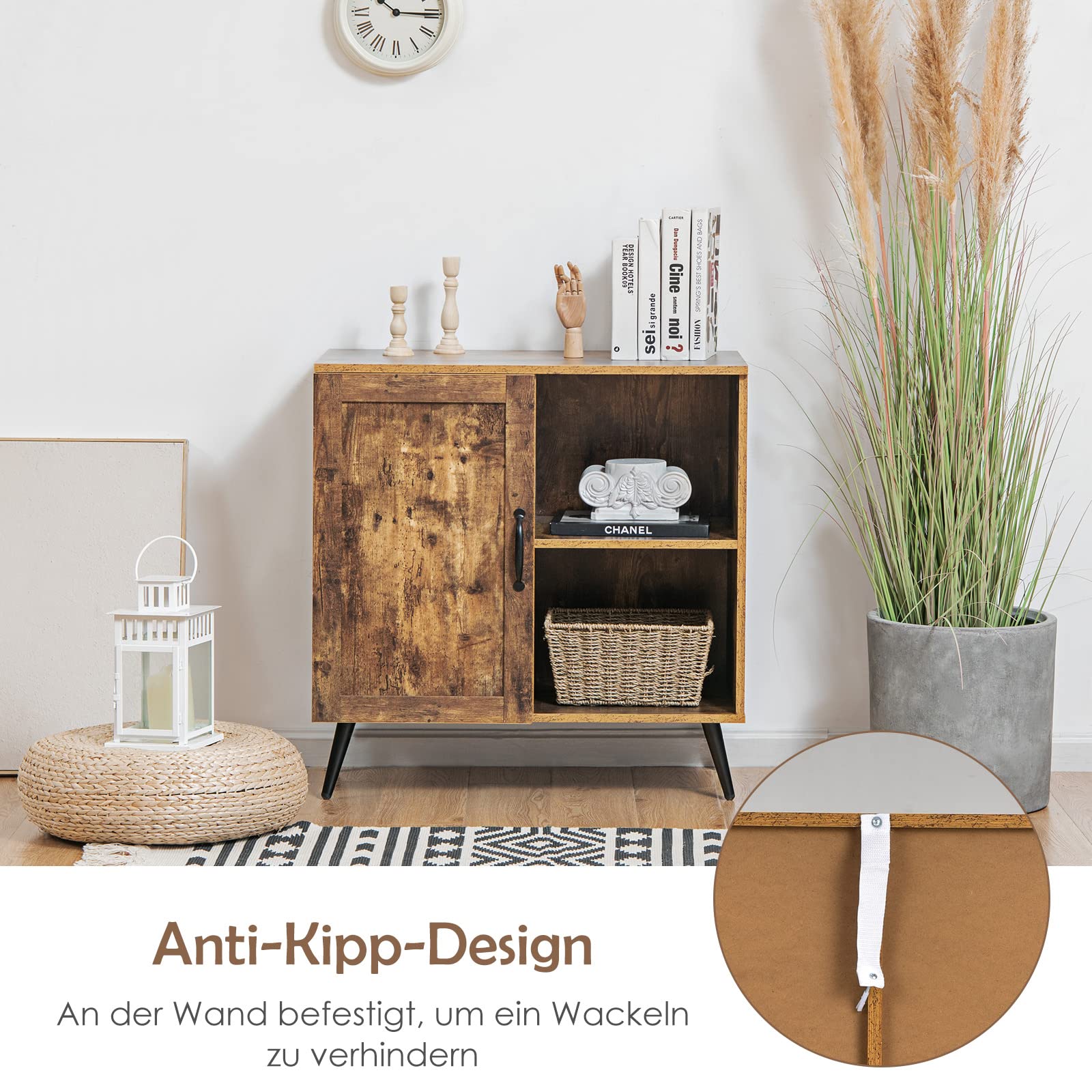 Wow, dieses COSTWAY Sideboard sieht nicht nur mega stylisch aus - es ist auch super praktisch! Mit 127,5cm Breite und 80cm Höhe findet es in fast jedem Raum Platz. Die 4 Türen verbergen jede Menge Stauraum, und die 5-fach verstellbaren Regale kannst du genau auf deine Sachen anpassen - ob Geschirr, Bücher oder Deko. Aus robustem Holzwerkstoff und MDF gefertigt, hält das Teil was aus. Die 5 Beine sorgen für stabilen Stand, und mit den Kippschutz-Sets kannst du es zusätzlich sichern. Das Vintage-Design in Braun passt super in Wohnzimmer, Flur oder Esszimmer. Die Metallscharniere laufen butterweich, und die Knöpfe sehen einfach klasse aus. Mit 12cm Bodenfreiheit kommst du easy mit dem Staubsauger drunter. Montage ist nötig, aber mit der Anleitung klappt das bestimmt! Einfach ein tolles Möbelstück das Style und Funktion perfekt verbindet.