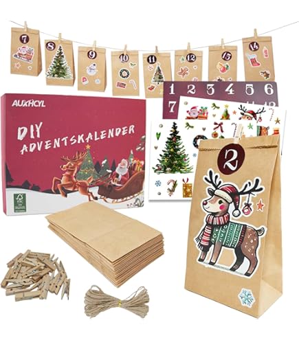 Weihnachtszeit ist Bastelzeit! Mit diesem Papierdrachen Adventskalender-Set kreierst du einen ganz persönlichen Weihnachtskalender. Im Set enthalten sind 24 naturbraune Kraftpapiertüten (22x14x5 cm), 24 schwarz-weiße Zahlenaufkleber und 24 doppelseitige Klebepunkte. Du kannst die Tüten mit Süßigkeiten, kleinen Spielzeugen oder Gutscheinen befüllen und mit den niedlichen Aufklebern verzieren. Die standfesten Bodenbeutel sehen aufgehängt an einer Schnur oder aufgereiht auf einem Regal richtig toll aus. Hergestellt in Deutschland in einer Werkstatt für Menschen mit Behinderung - da steckt viel Herzblut drin! Ohne Schere oder Kleber bastelst du im Handumdrehen einen einzigartigen Adventskalender, der sich perfekt als Geschenk eignet oder deine eigene Weihnachtsdekoration bereichert. So macht die Vorweihnachtszeit noch mehr Spaß!