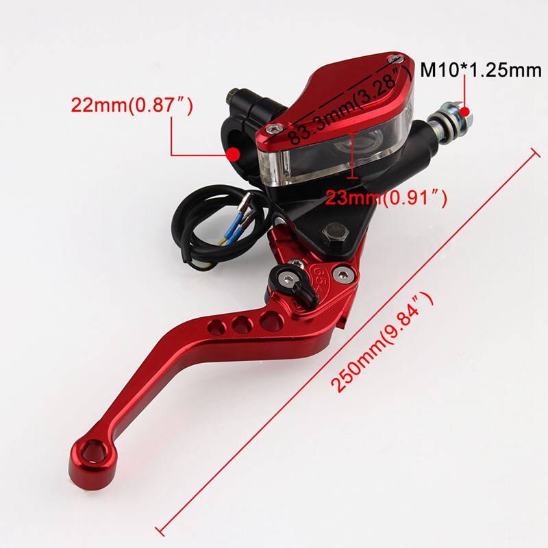 Upgrade für dein Bike! Diese CNC-gefrästen Hydraulik-Zylinder in Silber sehen nicht nur mega aus, sondern verbessern auch deine Bremsleistung. Aus eloxierter Aluminiumlegierung - super stabil und langlebig. Die Hebel sind einstellbar, damit du die perfekte Position für deine Hände findest. Mehr Sicherheit durch bessere Bremskraft! Das Ahornblatt-Design mit glänzender Oberfläche ist ein echter Hingucker. Passt für die meisten Motorräder, Dirt Bikes und ATVs mit 22mm Lenkerdurchmesser. Handlerlänge: 170mm, mit 10mm Montagebohrung für Rückspiegel. Einfach montieren und sofort den Unterschied spüren! Besseres Fahrgefühl und mehr Kontrolle. Verfügbar in verschiedenen Farben - such dir deinen Favoriten aus! Einfach einbauen und sicherer unterwegs sein!