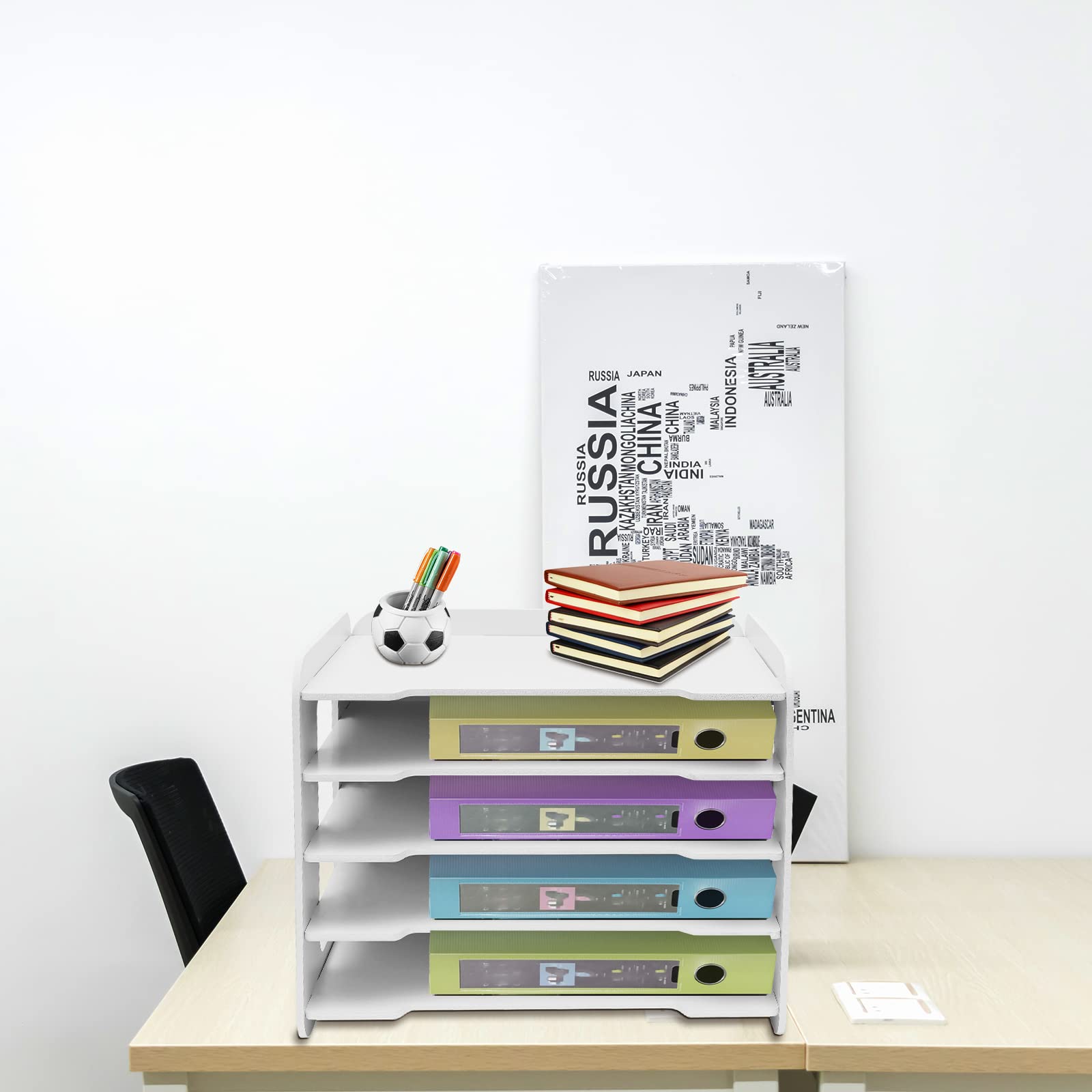 Schluss mit dem Chaos auf dem Schreibtisch! Diese 5-fach Briefablage bringt Ordnung in deine Dokumente. In schickem Weiß sieht sie dazu noch richtig gut aus.\\n\\nWas den Organizer so praktisch macht:\\n• 5 Fächer - für verschiedene Dokumententypen\\n• A4 Größe - passt für alle Standard-Dokumente\\n• Aus PVC-Holz-Kunststoff - stabil und langlebig\\n• Maße: 34x25x26,5cm - platzsparend\\n• Einfache DIY-Montage - machst du selbst in 5 Minuten\\n\\nDie Zapfen-Verbindung mit zusätzlichen Schrauben macht die Ablage super stabil. Da knickt nichts ein, selbst wenn sie voll beladen ist.\\n\\nOben auf der Ablage kannst du deine Stifte, Taschenrechner oder Hefter abstellen. Das offene Design sorgt dafür, dass du sofort siehst, was wo liegt.\\n\\nMit nur 1kg Gewicht ist sie leicht, aber trotzdem robust. Und das Material ist wasserdicht und schimmelresistent - hält also ewig.\\n\\nPerfekt fürs Büro, Home-Office oder auch für Schüler und Studenten. Endlich kein Suchen mehr nach wichtigen Unterlagen! Alles hat seinen festen Platz.\\n\\nUnd das beste: Die Montage macht sogar Spaß! Einfach die Teile zusammenstecken, Schrauben rein - fertig. So einfach kann Ordnung sein.