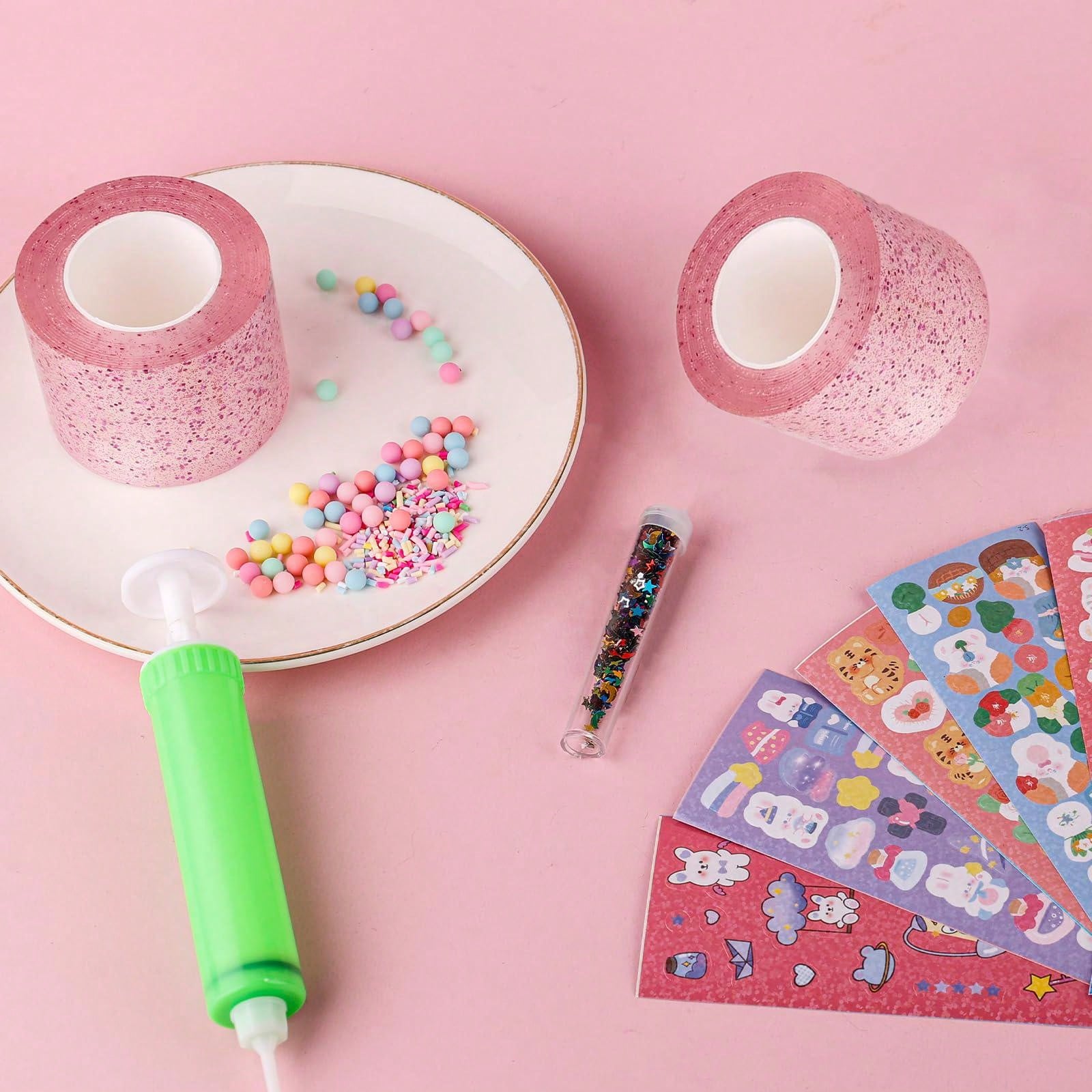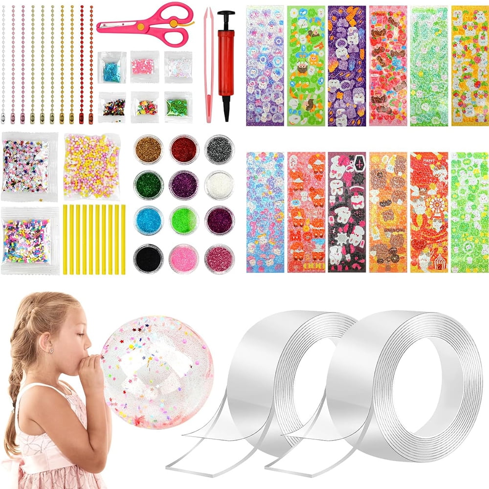 Total cooles Bastelset für kreative Kids! Mit diesem 18-teiligen Nano Tape Set können Kinder ihre eigenen Squishy-Bubbles herstellen. Enthält 2 Rollen Nano-Klebeband (je 1m x 5cm), Aufkleber, Schere, Ballonpumpe und Zubehör. Einfach Tape zuschneiden, befüllen, mit Föhn erwärmen und aufblasen. Fördert Feinmotorik und Kreativität. Perfekt für Geburtstage, Kindergeburtstage oder als Geschenk. Stundenlangen Bastelspaß garantiert!