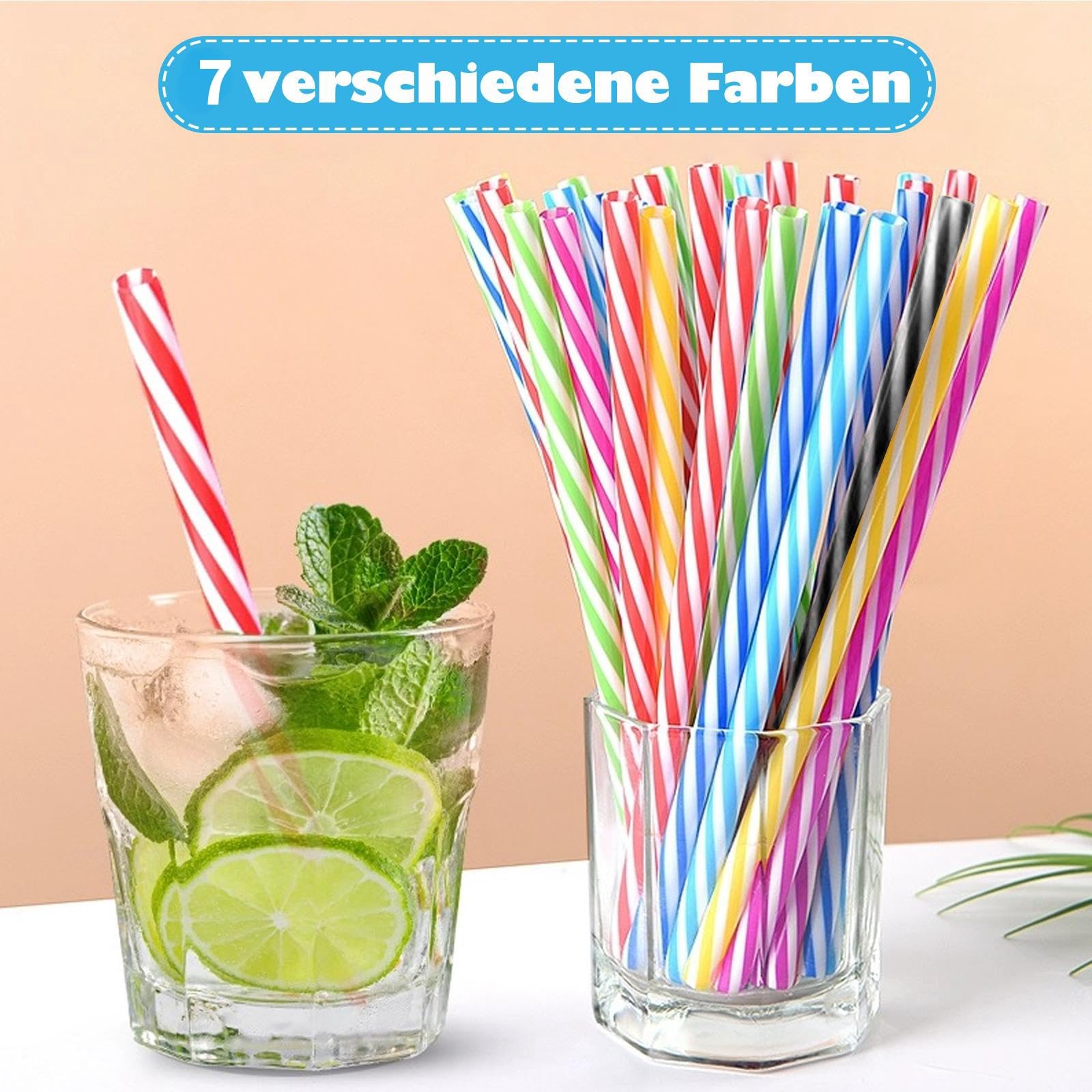 Umweltfreundlich und praktisch! 100 bunte Strohhalme aus robustem Plastik, dazu 2 Reinigungsbürsten. Jeder Strohhalm 23cm lang mit 0,28 Zoll Durchmesser - perfekt für Smoothies, Milchtee, Cocktails und Saftgetränke. BPA-frei und ungiftig, sicher für den täglichen Gebrauch. Die Regenbogen-Streifen machen jedes Getränk zum Hingucker. Lassen sich bei Bedarf kürzen für verschiedene Bechergrößen. Super für Partys, Cafés, Bars oder zuhause. Einfach mit der Bürste reinigen und immer wieder verwenden - so reduzierst du Müll und schonst die Umwelt. Einfach mal bestellen - deine Getränke schmecken gleich noch besser!