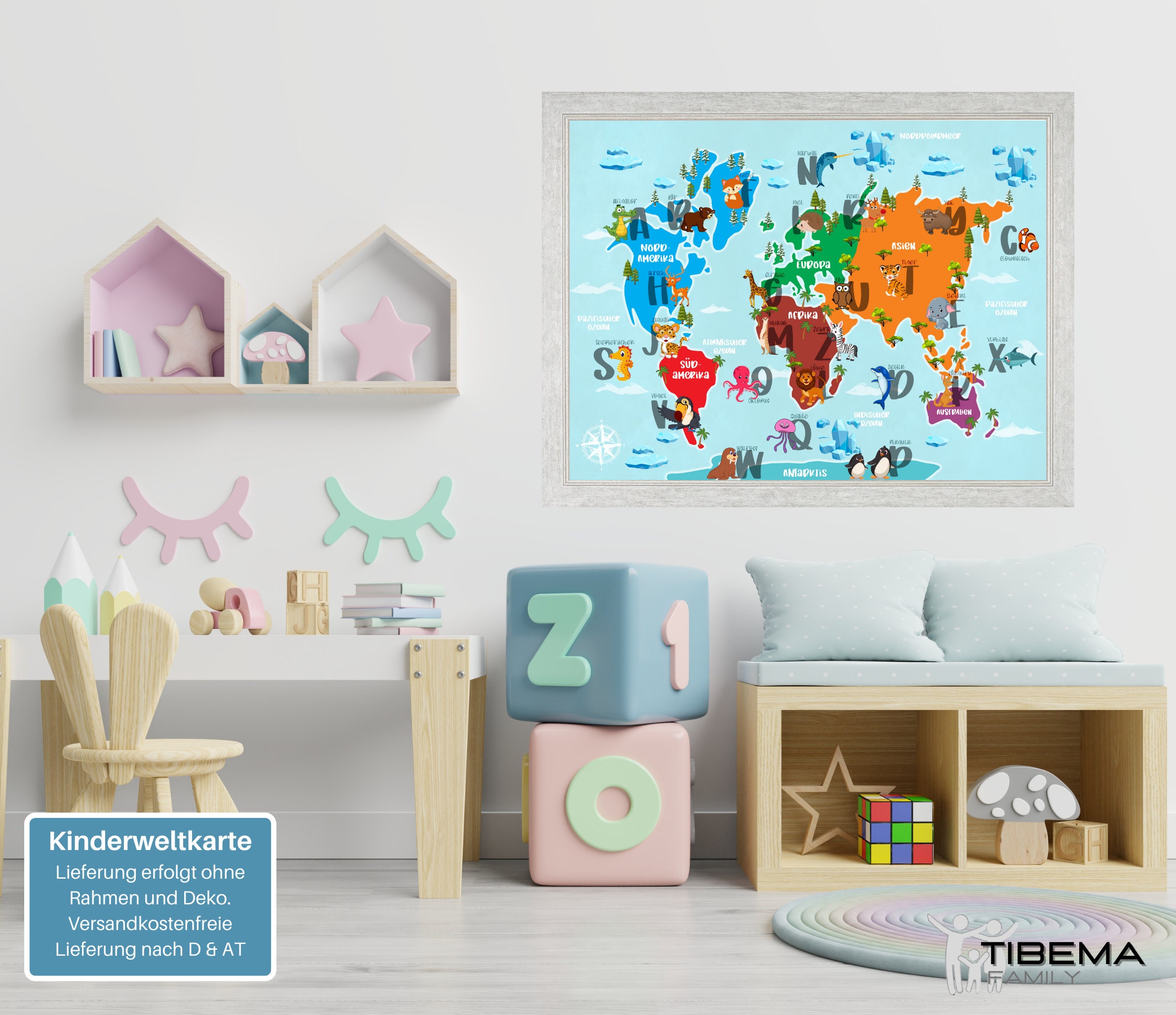 Wow, diese Weltkarte ist einfach der Hit für jedes Kinderzimmer! Stell dir vor: Eine riesige, bunt handgezeichnete Panorama-Weltkarte im XXL-Format 140 x 100 cm, die die ganze Welt auf einen Blick zeigt. Das Besondere? Jedes Detail ist liebevoll von Hand gezeichnet und koloriert - da gibt's immer was Neues zu entdecken! Und damit das Aufhängen richtig easy wird, liefern wir gleich die original tesa Powerstrips mit. 20 Stück sind dabei, damit die Karte bombenfest an der Wand hält, aber wenn du sie mal umhängen willst, geht's auch wieder rückstandslos ab. Perfekt fürs Kinderzimmer, Klassenzimmer oder Spielzimmer - so macht Geografie lernen richtig Spaß! Die fröhlichen Farben und niedlichen Illustrationen begeistern garantiert jedes Kind. Und keine Sorge wegen dem Aufhängen - mit den mitgelieferten Powerstrips ist das in wenigen Minuten erledigt. Die Karte ist auf hochwertigem Papier gedruckt und hält auch bei täglichem Betrachten lange schön. Ein echter Hingucker, der nicht nur schön aussieht, sondern auch noch bildet!