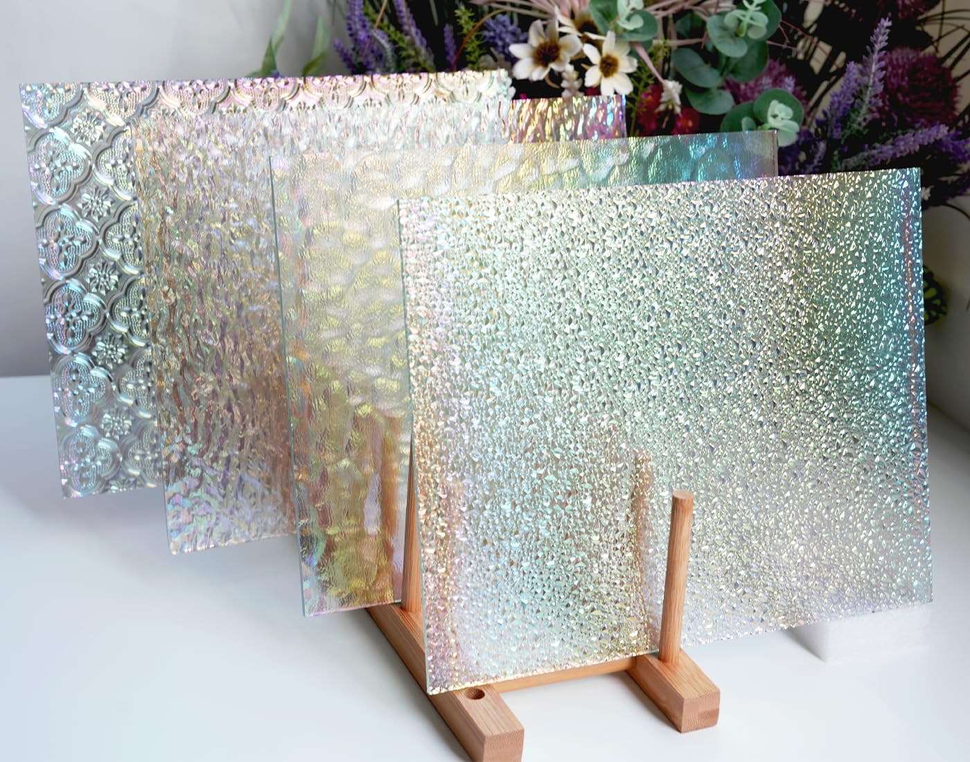 Wunderschönes irideszierendes Buntglas für deine kreativen Projekte! Dieses 6er-Set enthält 20x25cm große Glasscheiben in verschiedenen Mustern wie Wasserwelle, Begonienblüte und Diamant. Jedes Stück fängt das Licht ein und erzeugt ein magisches Schimmern. Bei hohen Temperaturen gebrannt für maximale Haltbarkeit und Hitzebeständigkeit. Die glatte Rückseite ermöglicht einfaches Zuschneiden mit einem Glasschneider. Perfekt für Buntglasfenster, Mosaikkunst, Lampenschirme oder dekorative Projekte. Ob für Innen- oder Außenbereich - dieses hochwertige Glas bringt deine Kunstwerke zum Strahlen und verleiht ihnen professionellen Glanz!