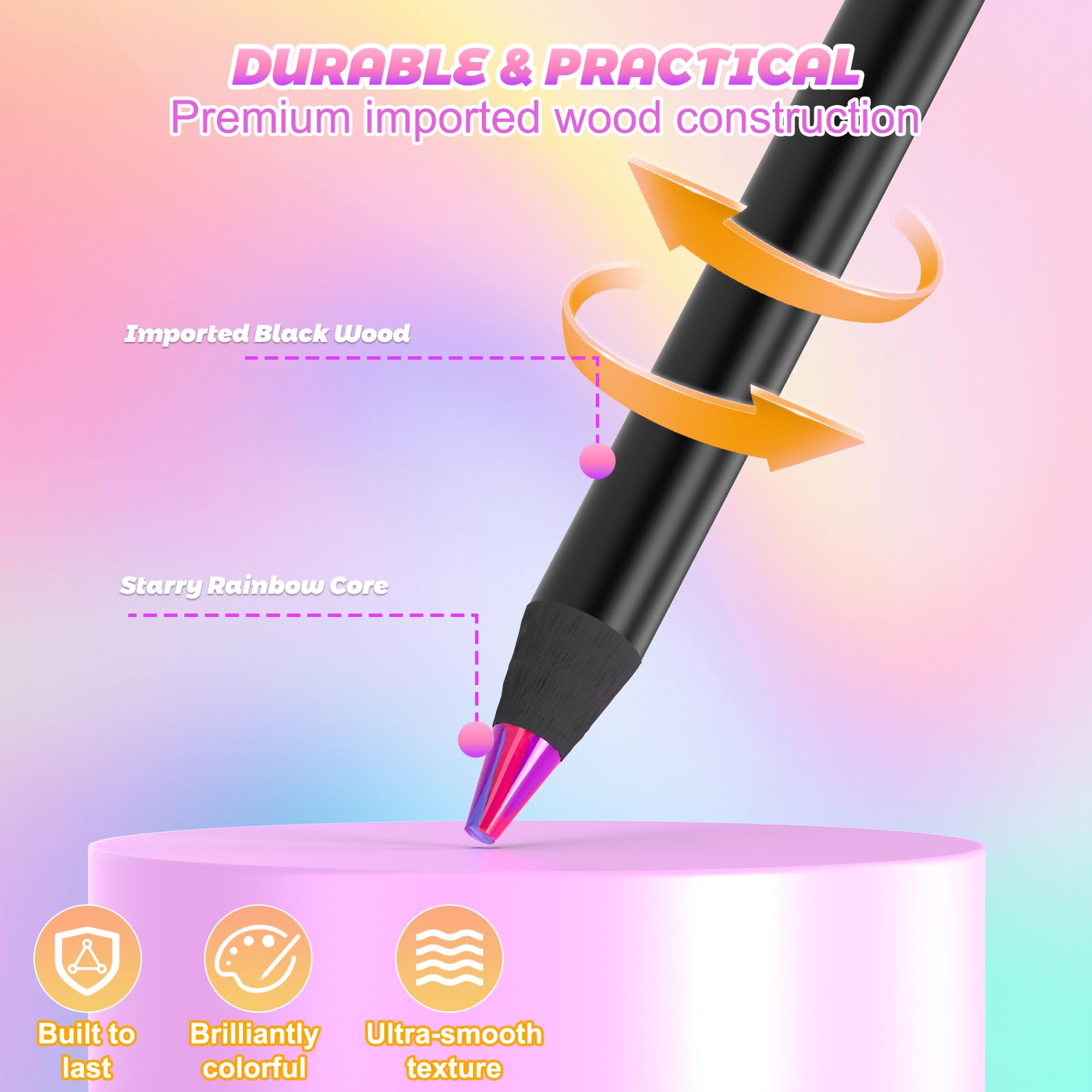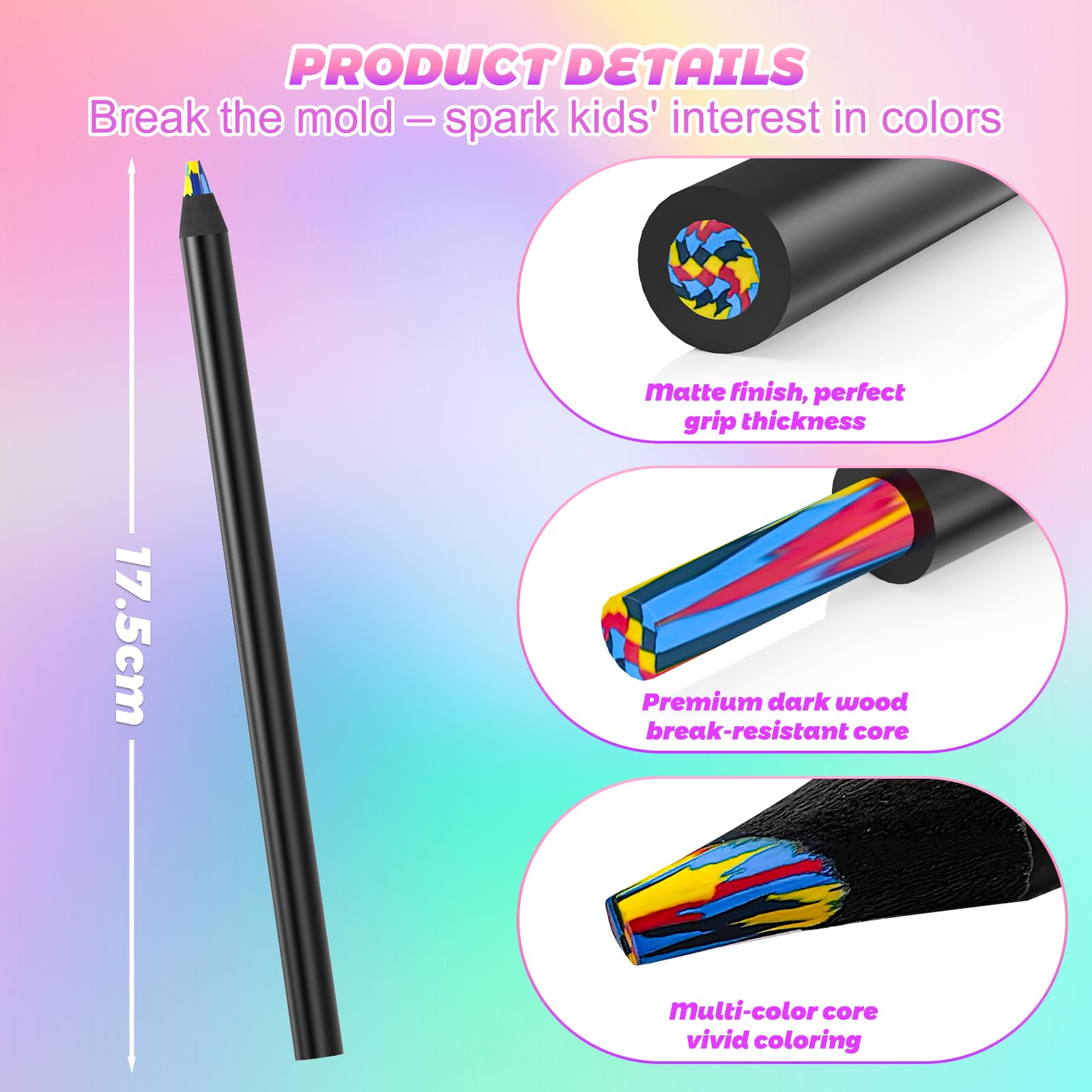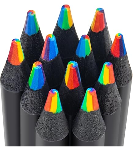 Kleine Künstler aufgepasst! Diese Nurila Regenbogen-Buntstifte im 12er-Set sind super bunt und machen richtig Spaß. Mit 7 Regenbogenfarben: Rot, Orange, Gelb, Grün, Blau, Indigo und Violett. Aus schwarzem Holz und mit HB-Mine aus natürlichem Graphit - mittlere Härte, bricht nicht leicht. Perfekt für Kinder von 4-12 Jahren. Jeder Stift 17,5cm lang, 0,75cm Durchmesser - rutschfest und gut in kleinen Händen zu halten. Ideal für Schultüten, als Geschenk oder für tägliches Malen. Ob für den Unterricht, Notizbücher oder Kunstprojekte - diese Stifte begeistern jeden Nachwuchskünstler. Auch kombinierbar mit anderen Schreibwaren. Einfach auspacken und losmalen! Perfekt für Geburtstage, Weihnachten oder den Schulanfang.